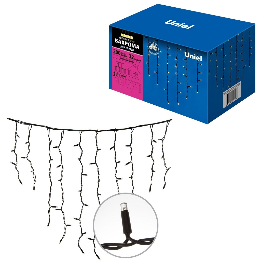 Описание гирлянды светодиодной Uniel ULD-B3010-200/TBK Warm white IP67, бахрома, Теплый белый UL-00003934, 3 м