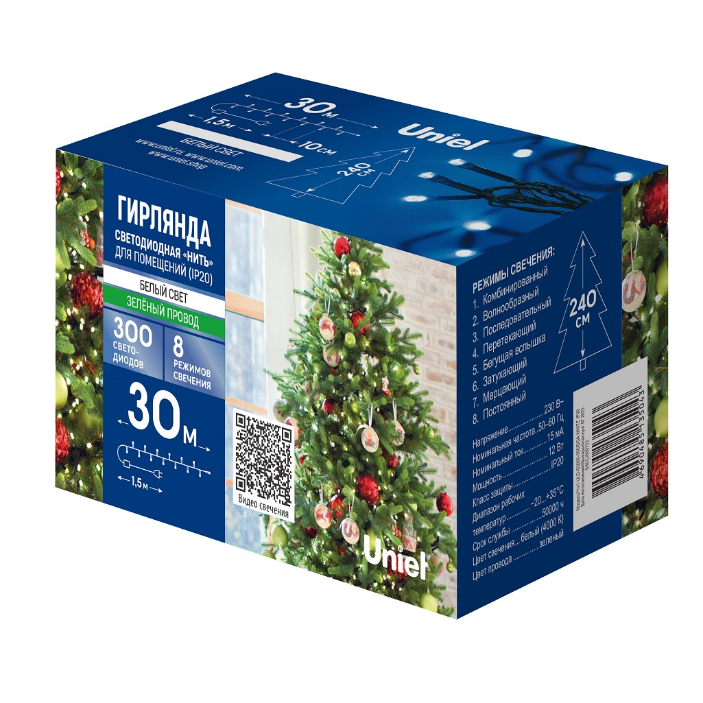 Гирлянда светодиодная Uniel ULD-S3000-300/DGA WHITE IP20, нить, Нейтральный свет, UL-00007313, 30 м предназначена для создания праздничной атмосферы не только в жилых помещениях, но и в коммерческих объектах, таких как торговые центры и кафе. Это универсальное решение для украшения как интерьеров, так и экстерьеров. Гирлянда состоит из 300 светодиодов и имеет длину 30 метров. Гирлянда белого цвета имеет температуру 4000К - нейтральный белый свет, близкий к дневному. Гирлянда выполнена из пластика с использование ПВХ для изоляции кабеля. Провод зеленого цвета гармонично вписывает ее в любой интерьер. Контроллер позволяет легко настроить цветовую палитру, добавляя разнообразие и яркость в оформление. Степень защиты IP20 подразумевает использование гирлянды внутри помещения. Длина сетевого кабеля составляет 150 см. Гирлянда предлагает 8 различных режимов освещения: волнообразный, последовательный, перетекающий, бегущая вспышка, затухающий, мерцающий, постоянный и комбинированный. Эти режимы сменяют друг друга по очереди. Для управления режимами используется контроллер, который идёт в комплекте.