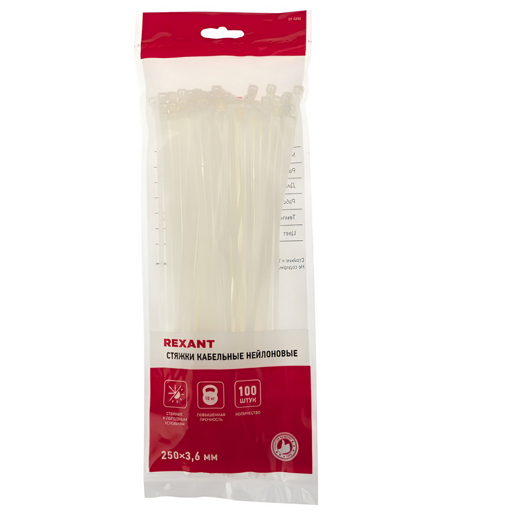 Технические характеристики стяжки Rexant 07-0250 нейлон 3.6х250 мм, упаковка 100 шт, белый