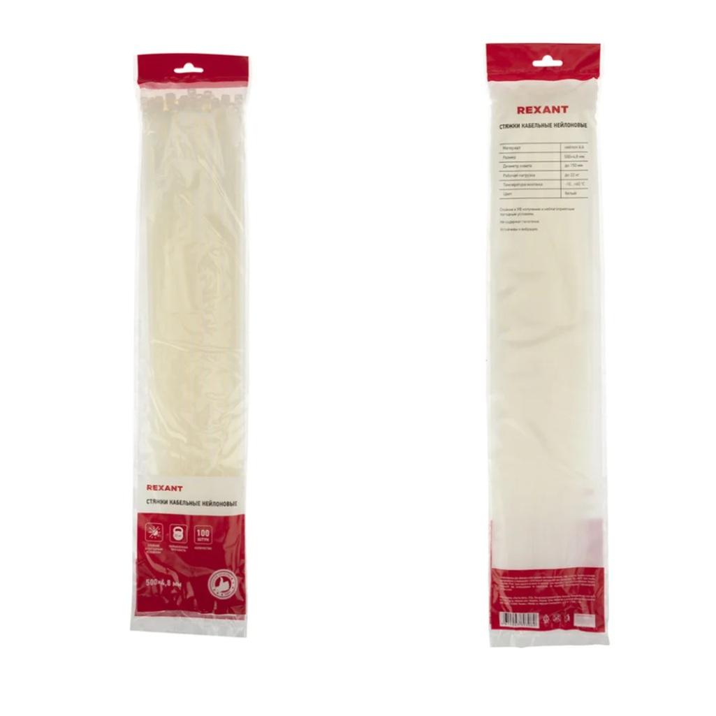 Стяжка кабельная Rexant 07-0500 нейлон, 4.8х500 мм, упаковка 100 шт, белый