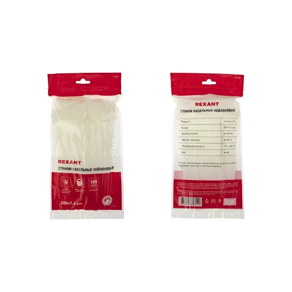 Стяжка кабельная Rexant 07-0202 нейлон 7.6х200 мм, упаковка 100 шт, белый