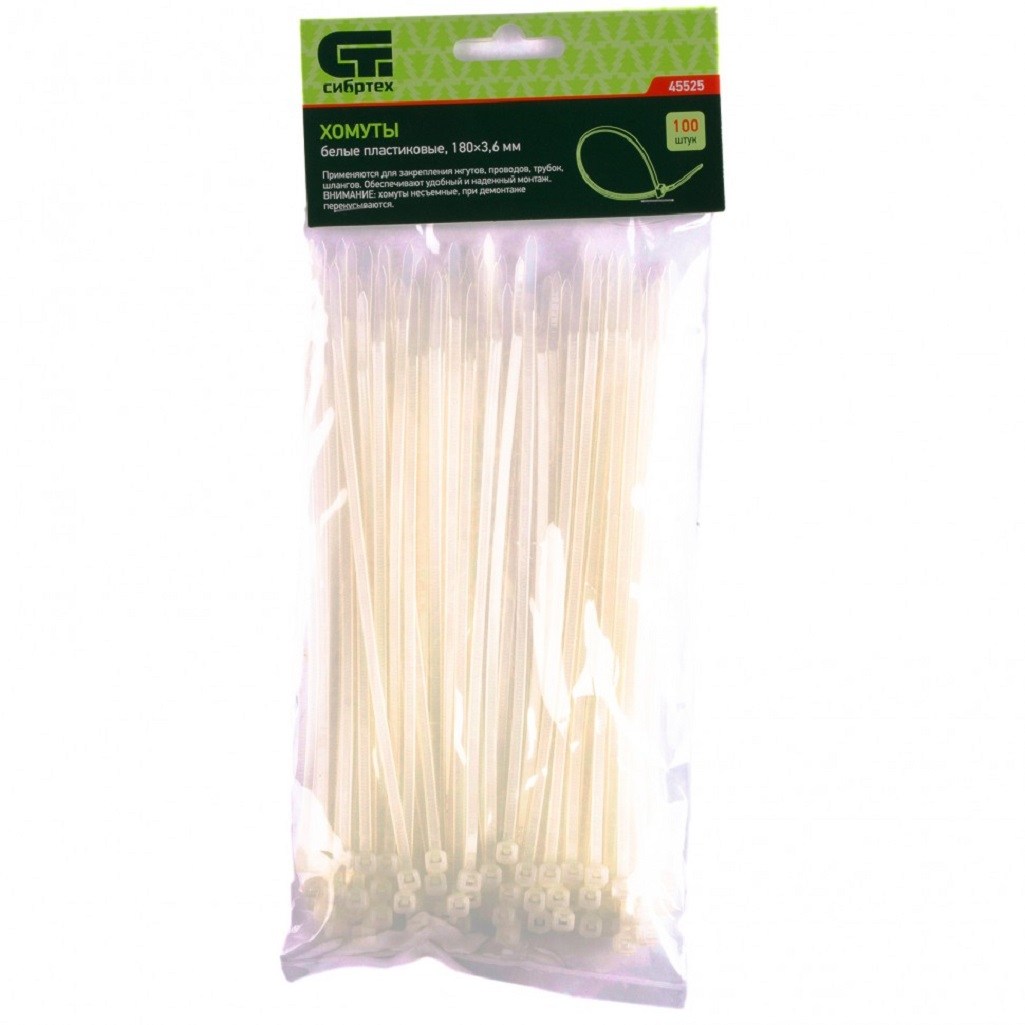 - Хомуты СИБРТЕХ пластиковые белые 3,6*180мм 100шт/уп