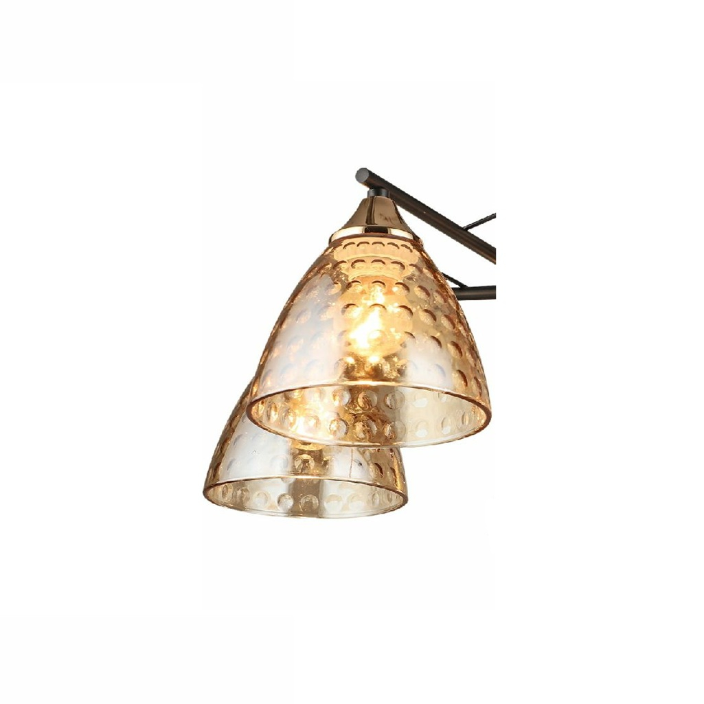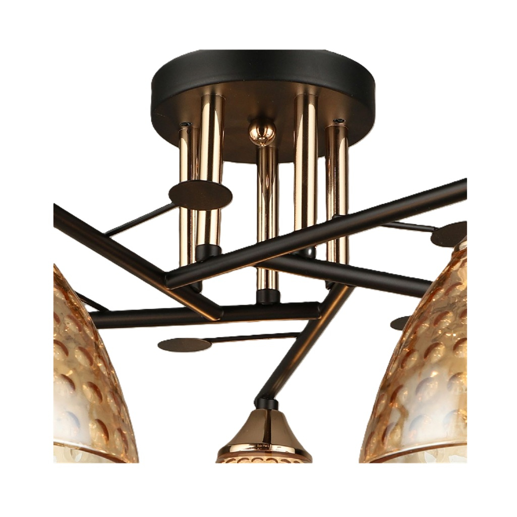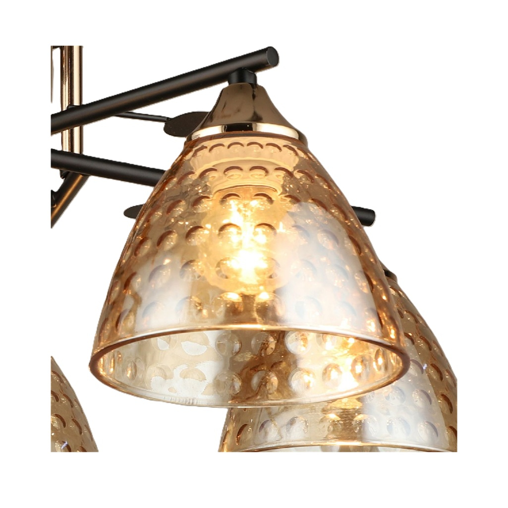 Люстра Reluce 03674-0.3-05 BK+FG, 5 ламп, Е27, 300 Вт, стекло, до 30 кв.м - это элегантное потолочное освещение в современном стиле, которое станет изысканным акцентом вашего интерьера. Дизайн этой модели привлекает внимание своим утонченным исполнением. Сочетание черной и бронзовой металлической арматуры создает эффектный контраст, а янтарные стеклянные плафоны добавляют теплоты и уюта. Качество исполнения соответствует высоким стандартам бренда. Прочная металлическая конструкция и качественные стеклянные элементы гарантируют долговечность и надежность в эксплуатации. Эта люстра создает особую атмосферу в помещении, наполняя его мягким, рассеянным светом. Янтарные плафоны в форме конуса мягко рассеивают свет, создавая комфортное освещение без резких бликов. Благодаря своему современному дизайну она гармонично сочетается как с минималистичным, так и с классическим интерьером, добавляя пространству изысканности и стиля.