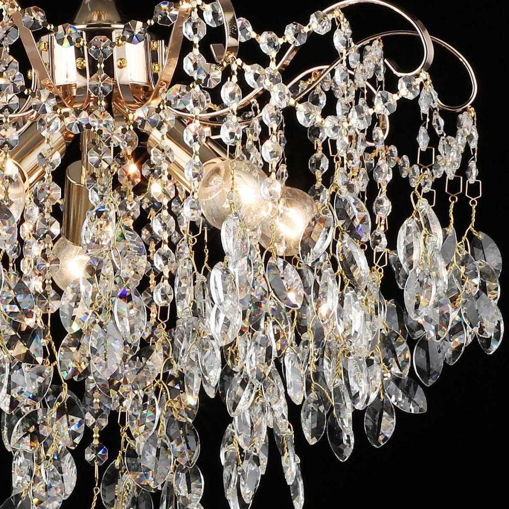 Основным достоинством изделия является применение хрустального декора. Ограненные подвески эффектно преломляют свет, создавая мягкое сияние и придавая помещению уют и визуальную глубину. Металлический каркас обеспечивает конструкции необходимую жесткость и устойчивость к нагрузкам. Защитно-декоративное покрытие сохраняет привлекательный внешний вид на протяжении всего срока эксплуатации. Светильник оснащен пятью рожками с патронами стандарта E14. Такое решение позволяет использовать лампы любого типа с соответствующим цоколем. Пять независимых источников света обеспечивают равномерное распределение освещения по всей площади комнаты без образования затемненных участков. При использовании современных светодиодных ламп энергопотребление существенно снижается без потери яркости свечения.