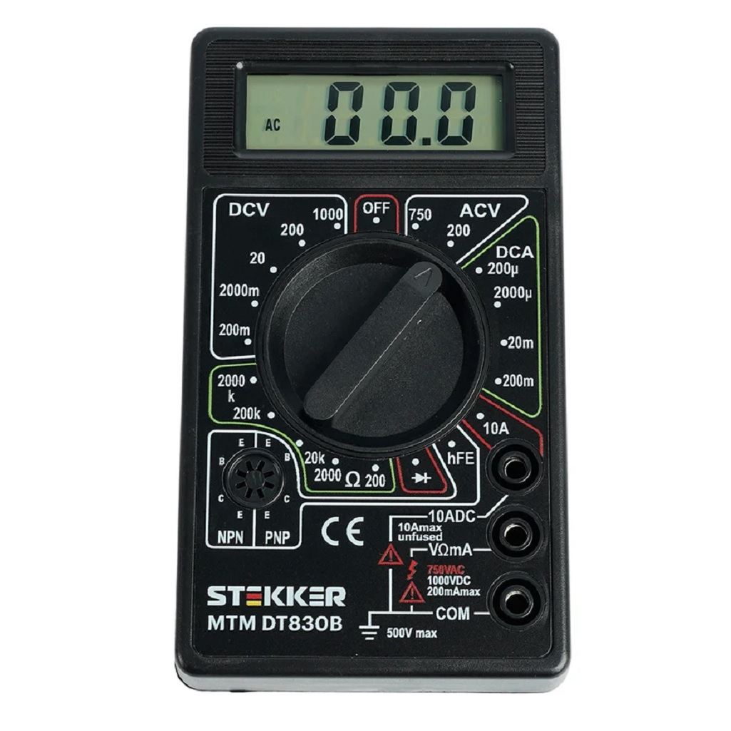 Мультиметр цифровой Stekker MTM DT830B 49992, защита от перегрузок, черный - это надежный, простой и недорогой мультиметр для базовых электроизмерений. Подходит для домашнего использования, начинающих электриков и радиолюбителей. Прибор позволяет измерять напряжение (постоянное и переменное), ток, сопротивление, проверять диоды и транзисторы, а также тестировать целостность цепи. Четкий цифровой дисплей с большими цифрами обеспечивает удобное считывание показаний даже в условиях слабого освещения. Интуитивно понятное управление с поворотным переключателем позволяет быстро выбрать нужный режим измерений. Компактный и легкий корпус делает прибор удобным для переноски и работы в труднодоступных местах.