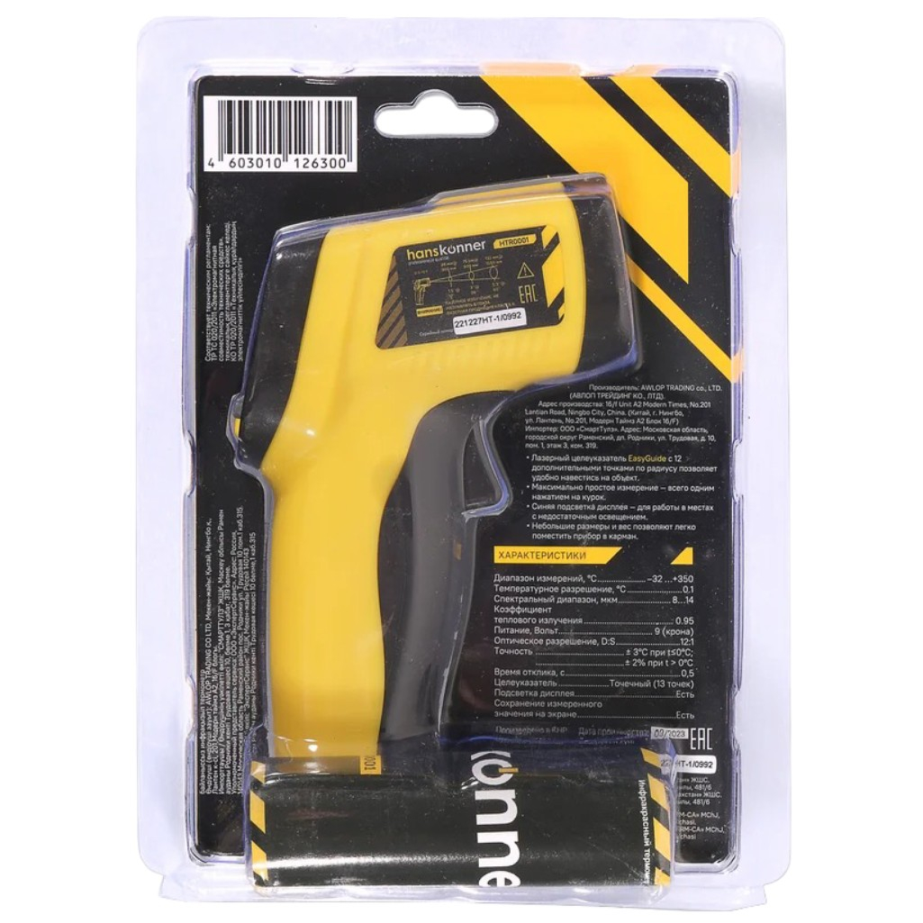 Пирометр бесконтактный Hanskonner EasyGuide HTR0001 инфракрасный термометр позволяет легко наводиться на цель. Для измерения достаточно одного нажатия на курок. Корпус имеет эргономичную пистолетную форму. Синяя подсветка дисплея облегчает работу в условиях недостаточной освещённости. Компактные размеры и небольшой вес позволяют удобно носить прибор в кармане. Пирометр оснащен 12 дополнительными точками по радиусу. Целеуказатель точечный. Благодаря компактным размерам и небольшому весу прибор можно легко размещать в кармане. Синяя подсветка дисплея позволяет проводить работы в местах со слабым освещением. Рука не устает даже во время длительной работы благодаря эргономичной пистолетной форме корпуса пирометра. Достаточно одного нажатия на курок, чтобы произвести измерение. Питание устройства осуществляется от батарейки 9V крона.
