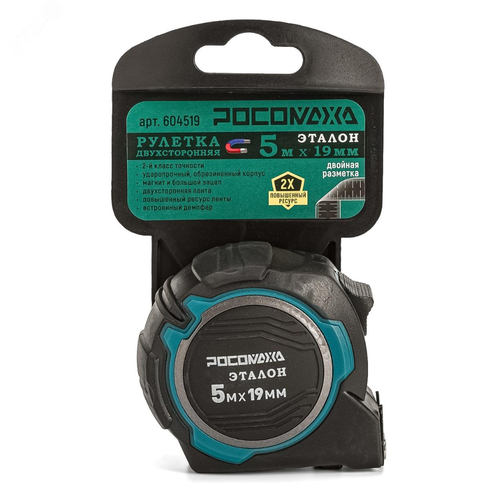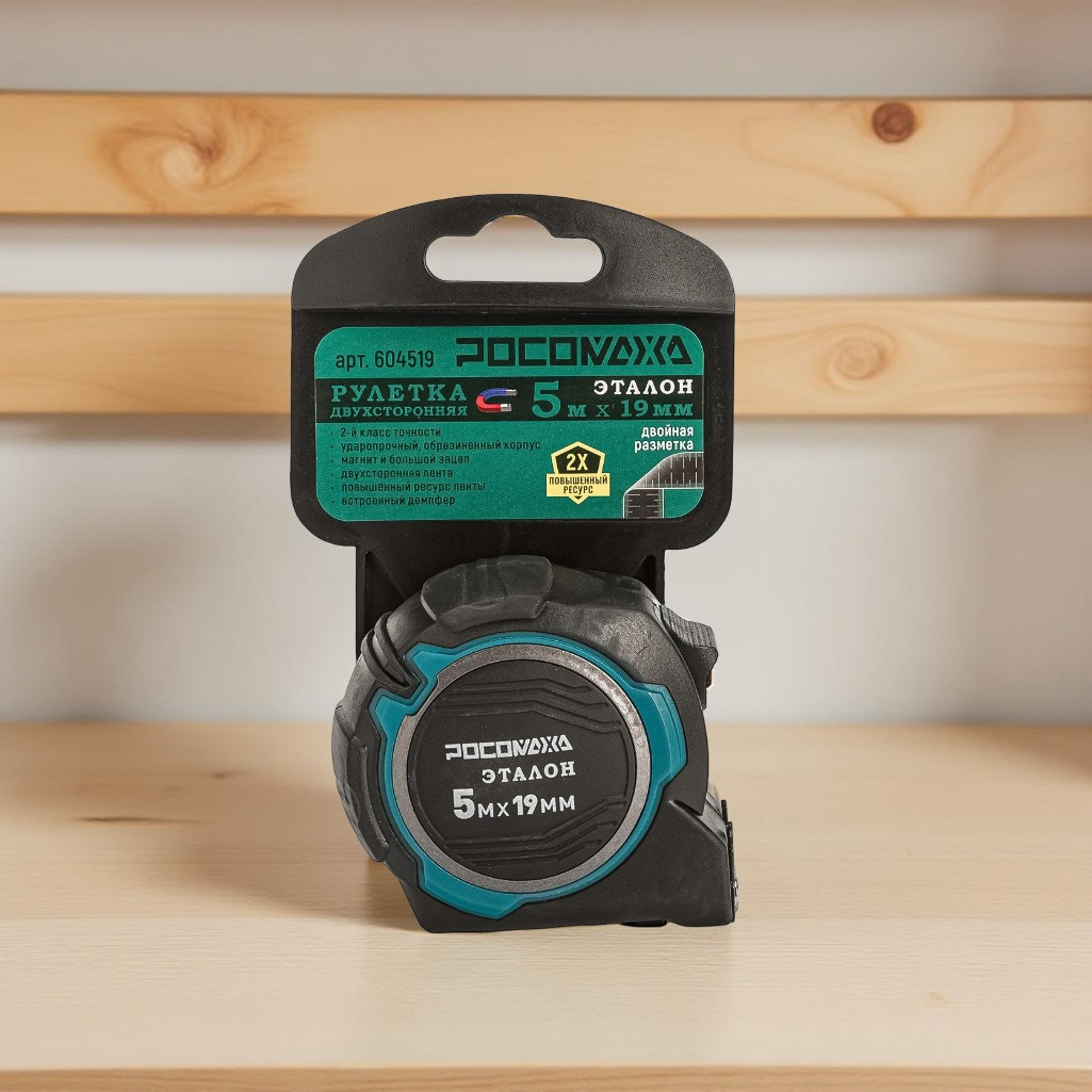 Рулетка двусторонняя Росомаха Эталон 604519, с устойчивой лентой и магнитом, 5 м х 19 мм предназначена для профессионального использования. Он помогает измерять поверхности и расстояния в ремонтных, строительных и других работах. Металлическая лента с защитным покрытием обеспечивает четкую разметку. Фиксатор надежно удерживает инструмент на нужной длине. Точность соответствует ГОСТу. Ударопрочный корпус из АБС-пластика выдерживает падения. Стальная лента прочная и не деформируется. Пружинный механизм рассчитан на долгий срок службы.