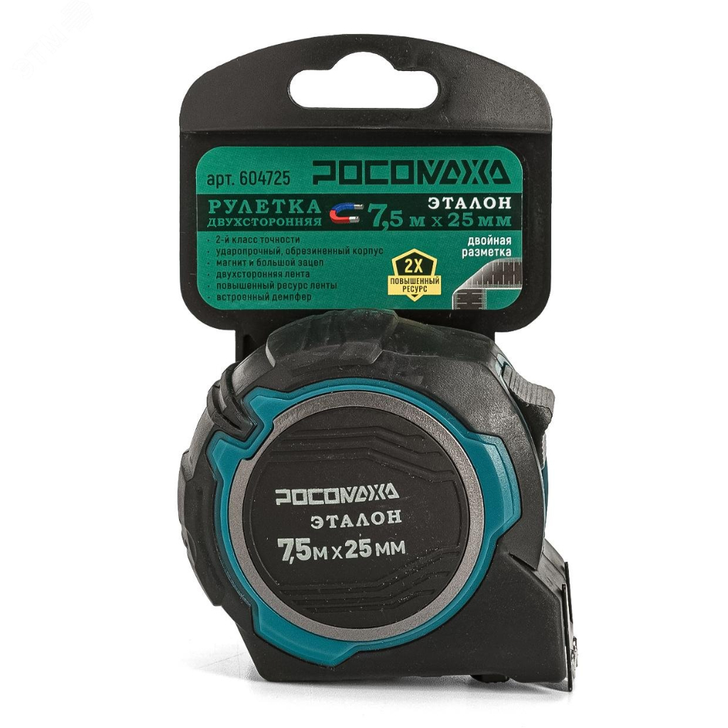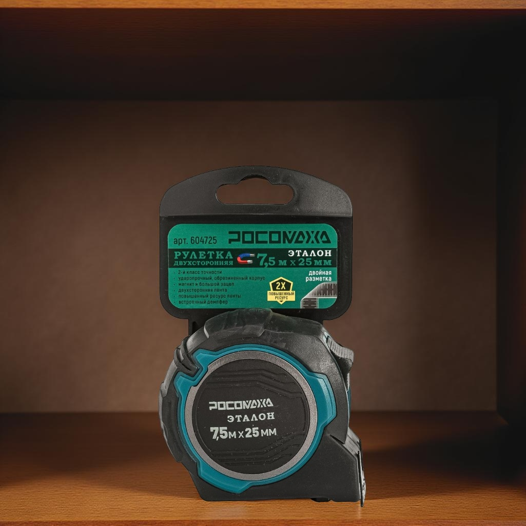 Рулетка двусторонняя Росомаха Эталон 607925, с устойчивой лентой и магнитом, 7.5 м х 25 мм предназначена для профессионального использования. Он помогает измерять поверхности и расстояния в ремонтных, строительных и других работах. Металлическая лента с защитным покрытием обеспечивает четкую разметку. Фиксатор надежно удерживает инструмент на нужной длине. Точность соответствует ГОСТу. Ударопрочный корпус из АБС-пластика выдерживает падения. Стальная лента прочная и не деформируется. Пружинный механизм рассчитан на долгий срок службы.