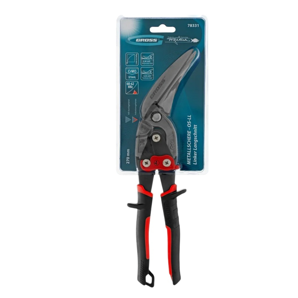 Ножницы по металлу Gross Piranha 78331, длина 250 мм, профессиональные левый и прямой рез выполнены из стали CrMo, с двухкомпонентными рукоятками, и могут выполнять прямой и левый проходной рез по листовому металлу. Ножницы режут цветные металлы и сталь холоднокатаную толщиной до 0.94 мм и нержавеющую сталь толщиной до 0.53 мм. Изготовлены из стали высокого качества, что значительно повышает прочность, износостойкость и рабочий ресурс инструмента. Режущие кромки губок подвержены индукционной закалке. Ножницы способны резать листы цветных металлов, изделий из стали разных марок с большим диапазоном толщины, включая нержавеющую сталь. Рычажный механизм обеспечивает увеличение режущей способности. Тип лезвий - прямой и левый.