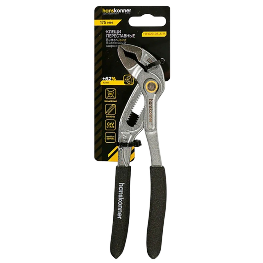 Клещи переставные Hanskonner HK1020-09-A175, кнопочный шарнир, длина 175 мм - это инструмент, регулируемый по размеру, предназначен для закручивания и откручивания гаек, болтов и прочих крепёжных элементов. Конструкция QuickShift обеспечивает возможность смены положения губок без необходимости перехвата, подобно трещотке. Кнопочный механизм позволяет изменять раскрытие зева в два раза быстрее, чем у инструментов с коробчатым шарниром. Изготовленные из прочной стали CrV, они отличаются долговечностью и твёрдостью рабочих поверхностей, равной 50 HRC, что предотвращает износ граней. Система ExtraWide, расширяющая раскрытие губок на 49%, позволяет заменить целый набор стандартных рожковых ключей. Хромированное покрытие ChromeShield защищает инструмент от коррозии и воздействия агрессивных сред. Эргономичные рукоятки SolidGrip, выполненные из утолщённого ПВХ, обеспечивают надёжный захват и устойчивы к внешним воздействиям благодаря гладкой, нескользящей поверхности. Пластиковые накладки на губки предохраняют хромированные элементы от повреждений при работе.