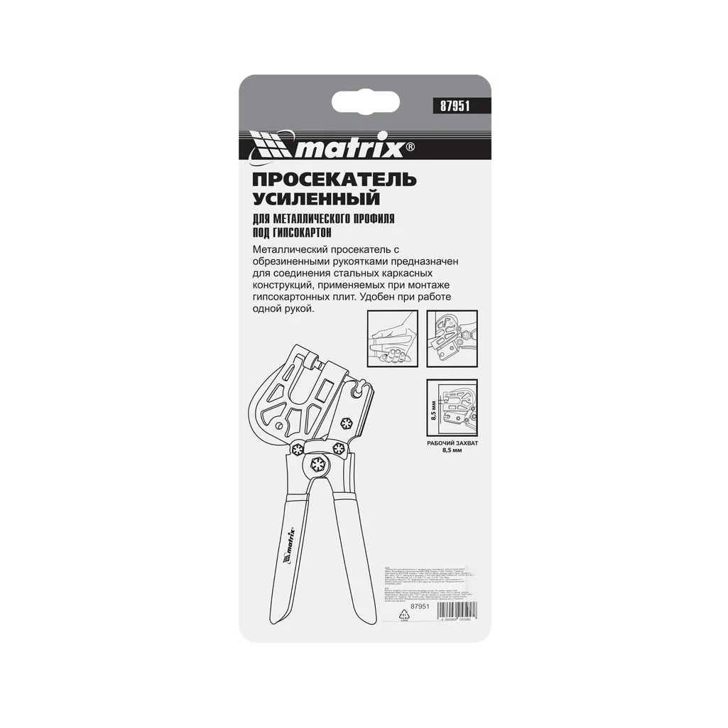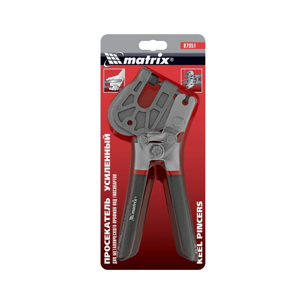 Просекатель усиленный Matrix 87951 для металлического профиля под гипсокартон - это металлический просекатель с обрезиненными рукоятками, который предназначен для соединения стальных каркасных конструкций, применяемых при монтаже гипсокартонных плит для возведения перегородок или монтажа подвесного потолка. Благодаря уникальному рычажному механизму и плавному ходу инструментом удобно работать одной рукой. Это очень важно, когда работа производится самостоятельно, без посторонней помощи. Компактный размер инструмента обеспечивает комфортную работу в стесненных и труднодоступных местах.