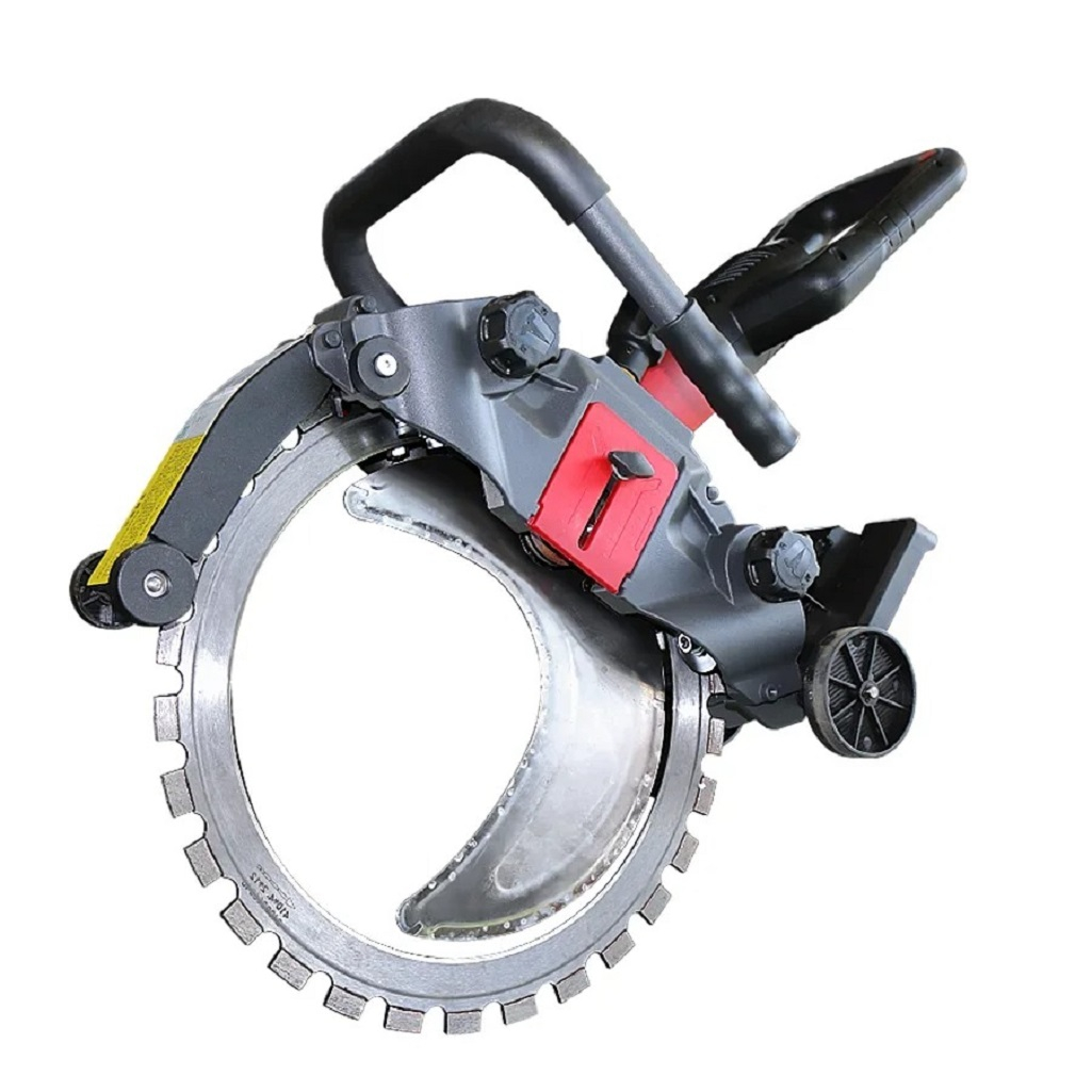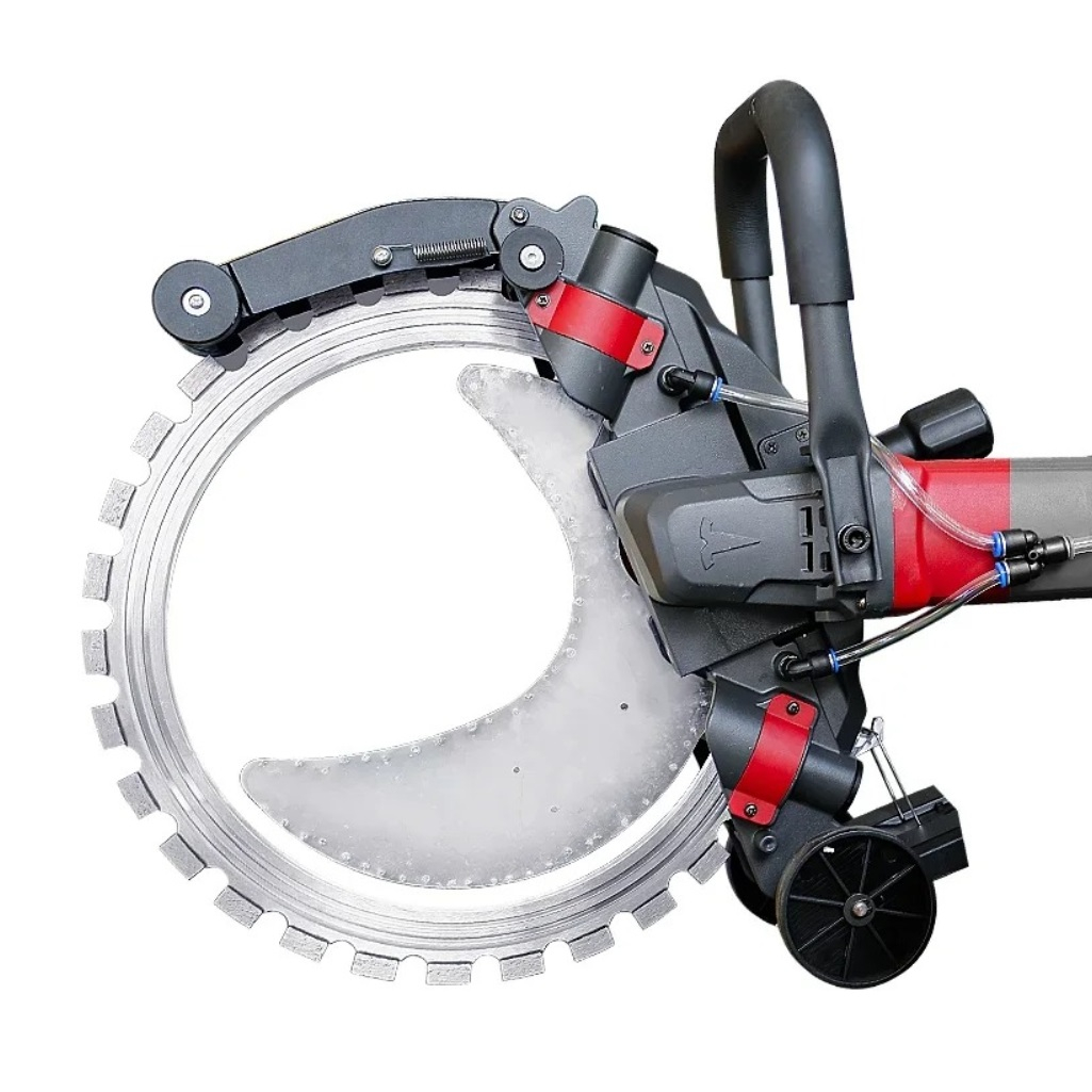 Высокая мощность гарантирует стабильную работу под нагрузкой, предотвращая перегрев. Режущий диск диаметром 410 мм позволяет выполнять глубокие резы до 300 мм за один проход. Прочный кожух защищает оператора, закрывая диск со всех сторон, кроме рабочей зоны. Металлическая конструкция часто включает направляющий подшипник или ролик для ровного перемещения инструмента вдоль линии реза. Две рукоятки обеспечивают удобное управление и подачу инструмента вперёд. Бетонорез отличается высокой производительностью, позволяя быстро и ровно резать бетон на значительную глубину.
