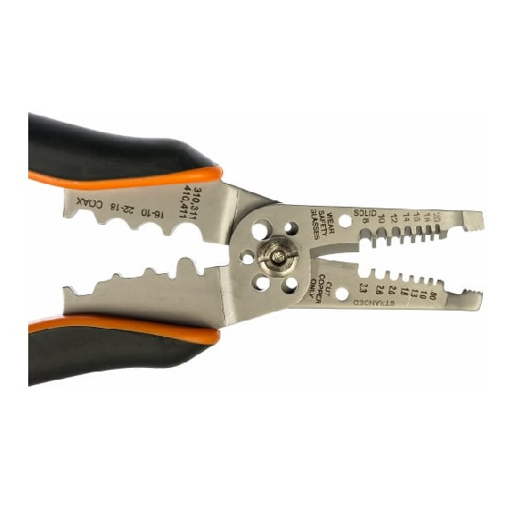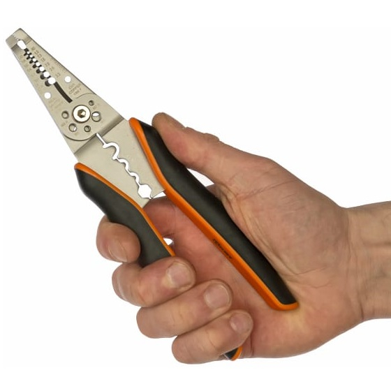 Инструмент для обжима и зачистки WS-01D предназначен для работ с проводами различных размеров. Рабочая часть изготовлена из нержавеющей стали, отличается высокой прочностью. Семипозиционные прецизионно заточенные лезвия легко удаляют оболочку, режут винты М2.5, М3, М3.5, М4, М5, и производят опрессовку наконечников сечением 0.5–6 мм². Эргономичные рукоятки способствуют удобному использованию инструмента.