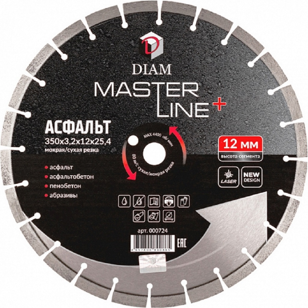 Описание диска DIAM Master Line асфальт, асфальтобетон, пенобетон, абразивы 350х3.2х25.4 мм, 000724
