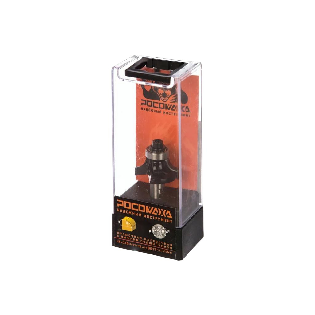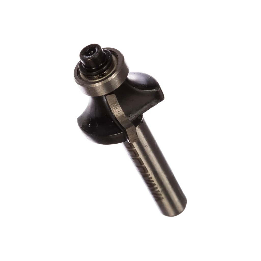 Фреза концевая Росомаха d8 мм, D25 мм, H11 мм, R6 мм, кромочная калевочная с нижним подшипником 801706 — это инструмент для ручных фрезеров и фрезерных станков, предназначенный для создания декоративной фигурной кромки (калевки) на деревянных деталях.