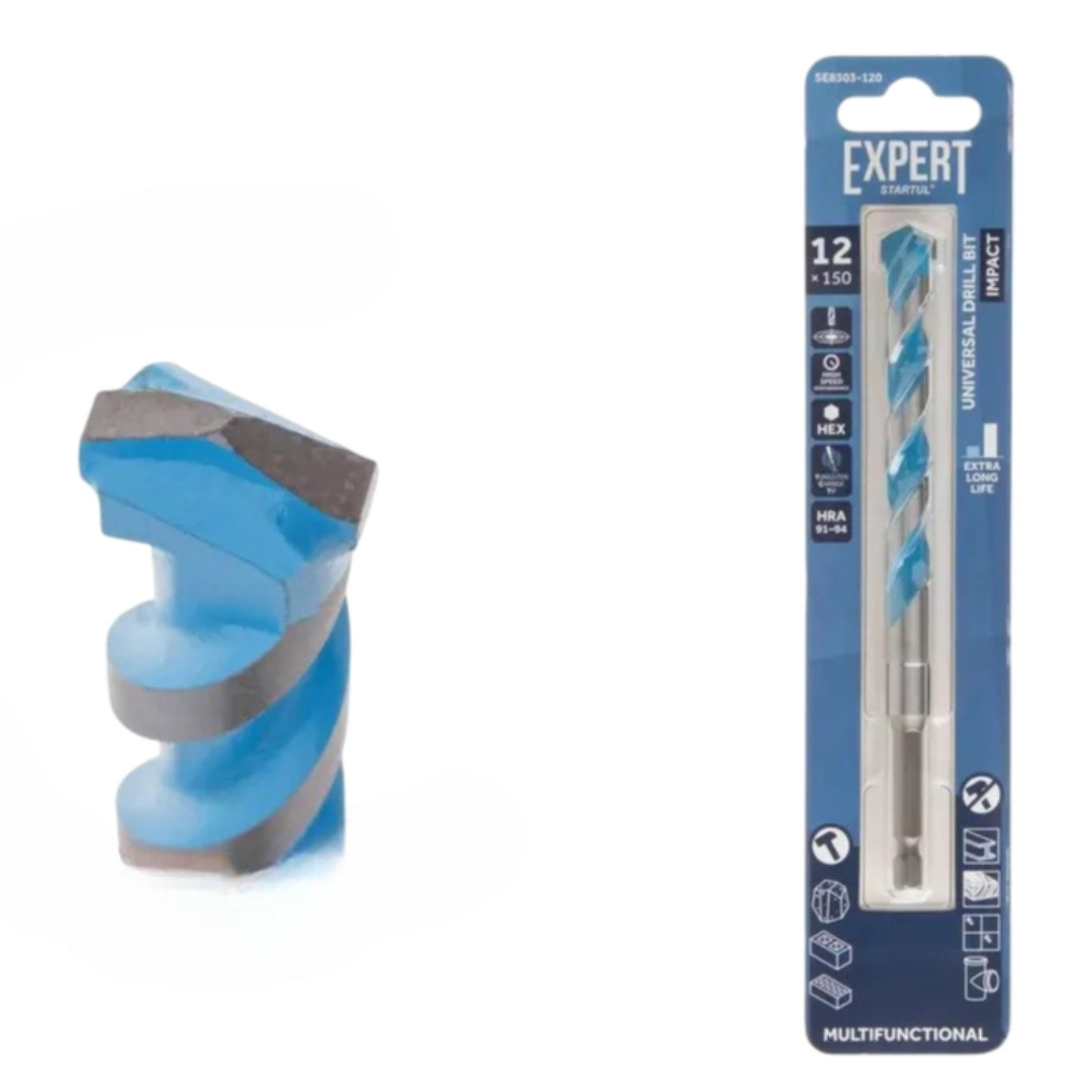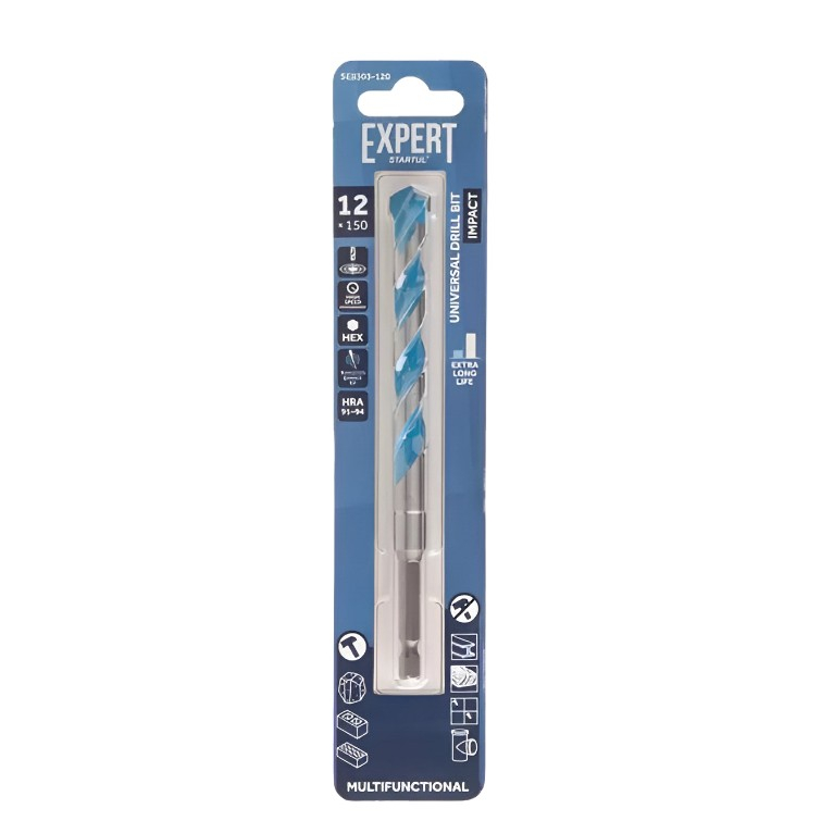 Сверло универсальное Startul Expert MultiFunctional SE8303-120, диаметр 12 мм  предназначен для широкого спектра сверлильных операций в различных материалах, включая бетон, кирпич, черепицу, газобетонные блоки, мягкую и цветную сталь, керамическую плитку средней твёрдости, древесину и ПВХ. Он может работать как в ударном, так и в безударном режимах. Специальная форма спирали обеспечивает быстрое удаление отходов сверления, что повышает эффективность инструмента и продлевает срок его службы. Максимальные обороты в минуту RPM составляют 500 при сверлении керамической плитки, 2000 при работе с бетоном, кирпичом и деревом.