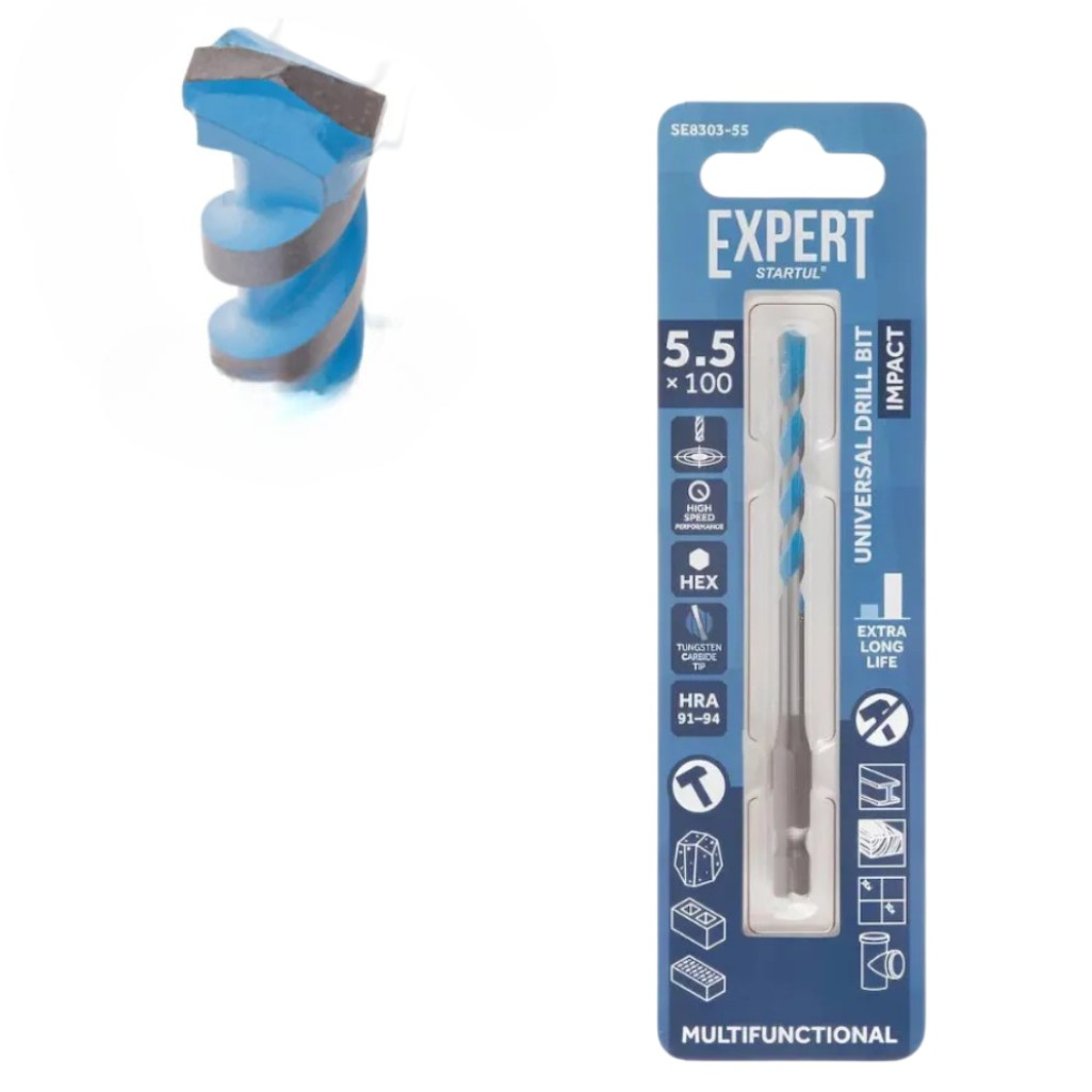 Сверло универсальное Startul Expert MultiFunctional SE8303-55, диаметр 5.5 мм предназначено для широкого спектра сверлильных операций в различных материалах, включая бетон, кирпич, черепицу, газобетонные блоки, мягкую и цветную сталь, керамическую плитку средней твёрдости, древесину и ПВХ. Он может работать как в ударном, так и в безударном режимах. Специальная форма спирали обеспечивает быстрое удаление отходов сверления, что повышает эффективность инструмента и продлевает срок его службы. Максимальные обороты в минуту RPM составляют 500 при сверлении керамической плитки, 2000 при работе с бетоном, кирпичом и деревом. Спиральная форма сверла обеспечивает эффективное удаление стружки, что способствует увеличению скорости работы и продлевает срок службы инструмента.