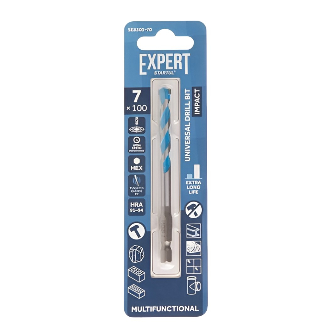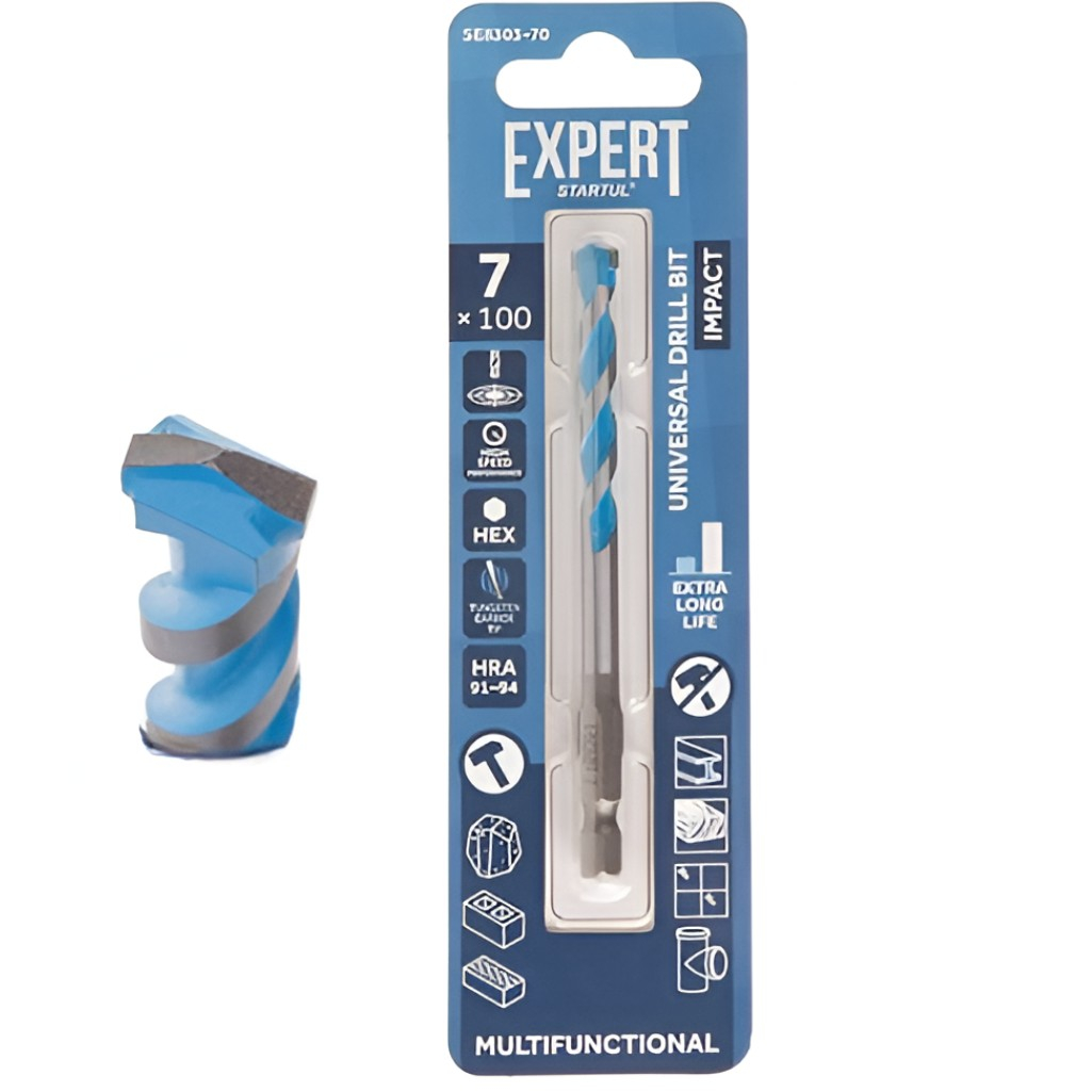 Сверло универсальное Startul Expert MultiFunctional SE8303-70, диаметр 7 мм предназначено для широкого спектра сверлильных операций в различных материалах, включая бетон, кирпич, черепицу, газобетонные блоки, мягкую и цветную сталь, керамическую плитку средней твёрдости, древесину и ПВХ. Он может работать как в ударном, так и в безударном режимах. Специальная форма спирали обеспечивает быстрое удаление отходов сверления, что повышает эффективность инструмента и продлевает срок его службы. Максимальные обороты в минуту RPM составляют 500 при сверлении керамической плитки, 2000 при работе с бетоном, кирпичом и деревом. Спиральная форма сверла обеспечивает эффективное удаление стружки, что способствует увеличению скорости работы и продлевает срок службы инструмента.