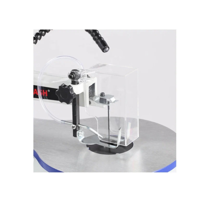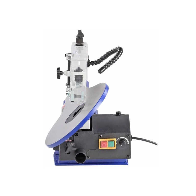 Дополнительно лобзиковый станок оснащен LED-подсветкой с гибкой конструкций, которая позволяет протянуть подсветку в нужное оператору место. В основании станка есть специальные отверстия для крепления к верстаку, что придает устойчивость и дополнительную безопасность. На корпусе расположен отсек для хранения инструмента и пилок. Малые габариты и вес позволяют использовать станок даже в небольшой мастерской.