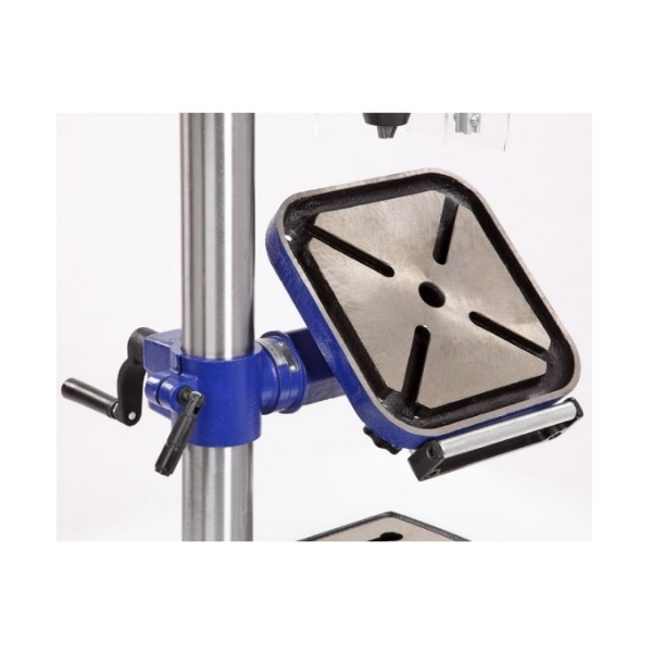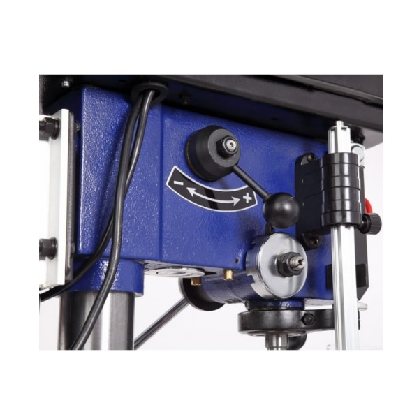 Скорость вращения шпинделя регулируется от 340 до 2200 об/мин с помощью перемещения положения рукоятки с левой стороны сверлильной головы. На стойке размещена зубчатая рейка, а регулировка положения стола происходит с помощью рукоятки.