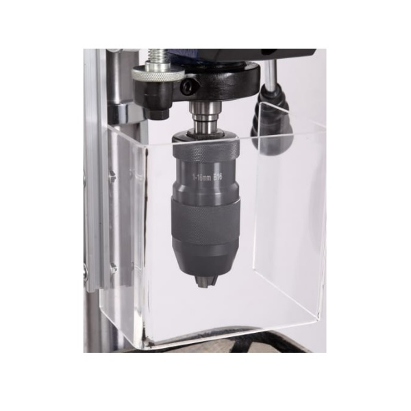 Шкала с левой стороны от выключателя указывает на ход пиноли шпинделя. В опоре предусмотрены два монтажных отверстия для крепления к верстаку. Тиски идущие в комплекте со станком крепятся через специальные пазы на рабочий стол станка. На передней панели размещены кнопки подсветки рабочей зоны и лазерного указателя.