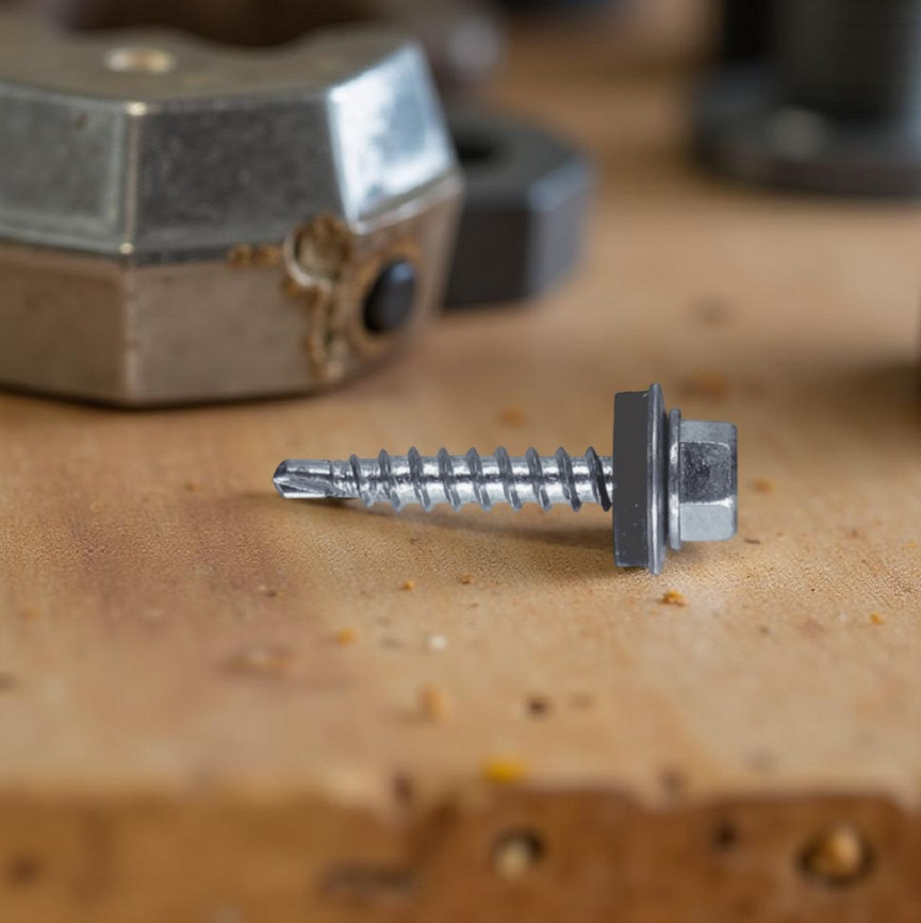 Саморез кровельный с шайбой EPDM Жесть УТ-00002791 оцинкованная сталь, 5.5х51 мм, упаковка 35 шт, контейнер 0.28 л предназначен для фиксации кровельных материалов, таких как металлические листы, профнастил, термопанели и сэндвич-панели, к деревянным или металлическим основаниям. Его конструкция включает шестигранную головку, наконечник в форме сверла и шайбу с EPDM-прокладкой, которая обеспечивает герметичность и защиту от влаги. Головка самореза имеет шестигранную форму с буртиком, а наконечник выполнен в виде сверла с частой резьбой. Эти саморезы подходят для монтажа различных элементов кровли, начиная от обрешетки и заканчивая фальцевой кровлей или композитными панелями. Они также используются при установке козырьков, водосточных желобов и навесов. Саморез кровельный с шайбой EPDM Жесть изготовлен из высококачественной оцинкованной стали, что обеспечивает его долговечность и устойчивость к коррозии.