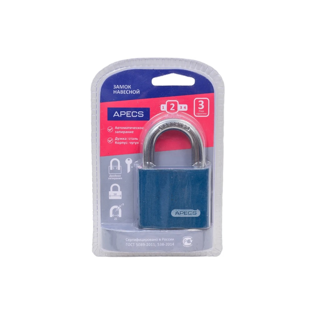 Описание замка навесного Apecs PD-02-50, автоматическое запирание, чугун, сталь