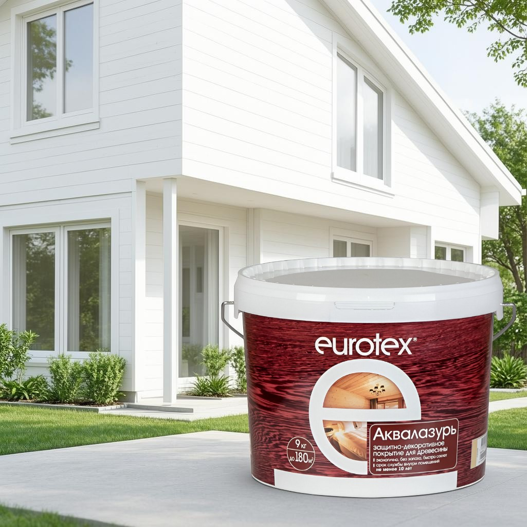 Защитно-декоративное покрытие Eurotex Аквалазурь для древесины, полуглянцевый блеск, Белый, 9 кг