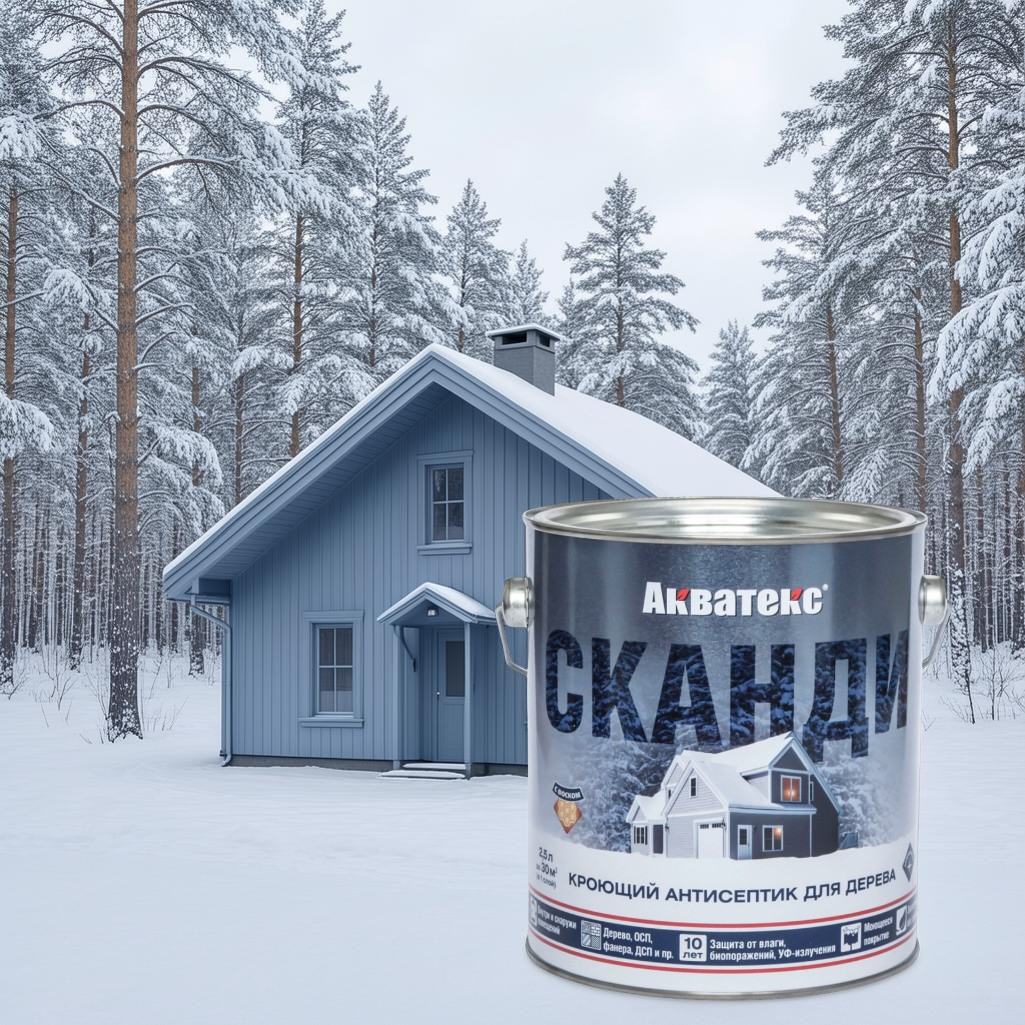 Антисептик Акватекс Сканди для дерева, кроющий Северное море, полуматовое покрытие, 2.5 л предназначен для декоративной обработки древесины с целью получения плотного кроющего покрытия, скрывающего рисунок, но сохраняющего видимой структуру древесины; защиты древесины от воздействия влаги, появления и распространения биопоражений (гниения, плесени, грибка, синевы), УФ-излучения (потемнения, выгорания) и других атмосферных воздействий; обновления деревянных поверхностей, ранее окрашенных алкидными или акриловыми составами, в том числе темных тонов.