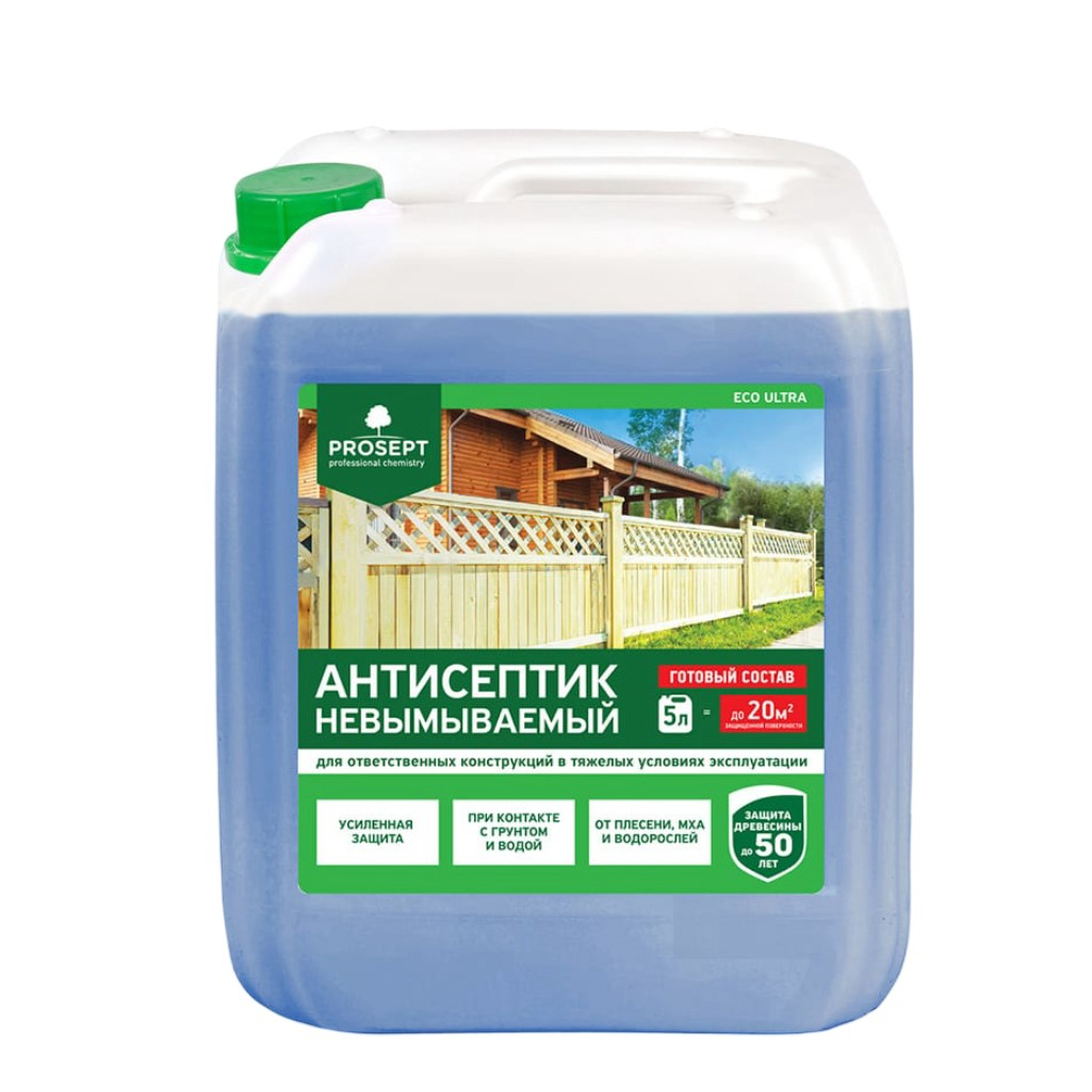Антисептик Prosept ECO Ultra, для ответственных конструкций, защита древесины, невымываемый, 5 л предназначен для надежной защиты древесины различных пород в экстремальных условиях эксплуатации, таких как длительный контакт с почвой и прямое воздействие атмосферных осадков. Область применения включает конструкционные элементы каркасных домов, нижние венцы бревенчатых или брусовых зданий, стропильные системы кровли, перекрытия, террасы, заборы, элементы ландшафтного дизайна, садовую мебель и причалы. После обработки антисептиком древесина приобретает светло-голубой оттенок, который со временем меняется на медово-коричневый. При эксплуатации без лакокрасочного покрытия она может выгореть до серебристо-серого цвета. Работы следует проводить при температуре не ниже +5 градусов Цельсия. Наносить рабочий раствор необходимо кистью, валиком с синтетическим ворсом или распылителем в 2-3 слоя с промежуточными сушками по 20-30 минут. Расход средства при двукратном нанесении составляет 250-350 грамм на квадратный метр.