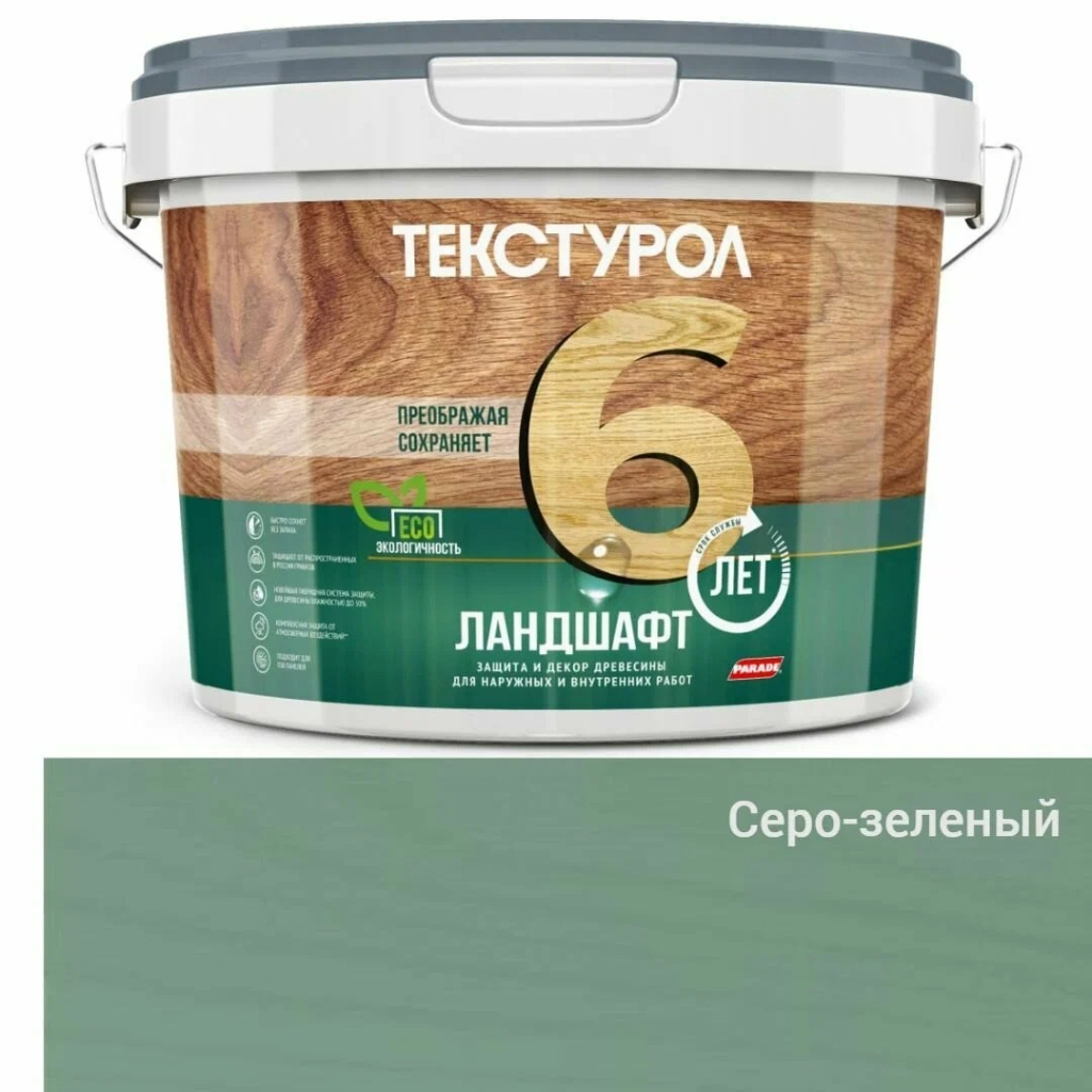 Пропитка Текстурол Ландшафт, защита и декор древесины, с воском, Серо-зеленый, 2.5 л - это средство защиты, созданное на водной основе. Оно сочетает в себе декоративные и защитные свойства, обладает высокой укрывистостью и подходит как для внутренних, так и для наружных работ. Предназначено для отделки деревянных изделий и конструкций, включая обшивочные доски, стеновые панели, фасады, заборы, плинтусы, древесно-волокнистые и древесно-стружечные плиты, фанеру и шпон. Рекомендуется для использования в деревянных домах, садовых постройках и заборах. Создает шелковисто-матовое покрытие, которое подчеркивает текстуру древесины, при этом обладает высокой укрывистостью. Благодаря тиксотропности, состав легко и экономично наносится, без подтеков и разбрызгивания. Можно применять на древесине с влажностью до 30%.