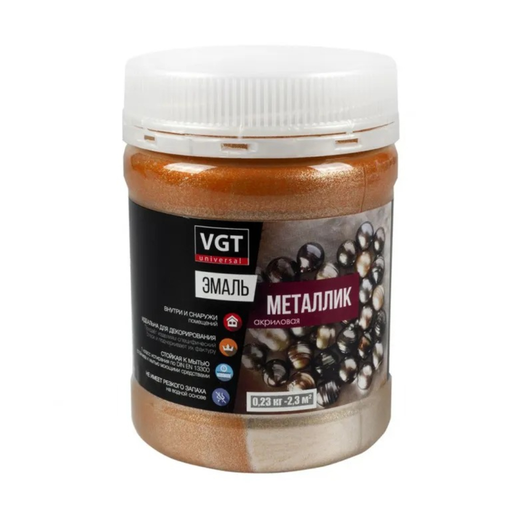 Эмаль акриловая VGT ВД-АК-1179 Металлик, для декоративных работ, бронза, 0.23 кг предназначена для декоративной окраски таких поверхностей как (минеральные, деревянные, гипс, керамика, различные типы обоев, изделия из полистирола и пластика, алюминий, оцинковка). Применяется для наружных и внутренних работ. Обладает натуральным металлическим блеском, высокой свето-, водо- и атмосферостойкостью. Декоративный эффект эмали зависит от цвета подложки, толщины слоя покрытия и способа нанесения. Полный набор прочности и устойчивость к влажной уборке достигается через 2 недели.