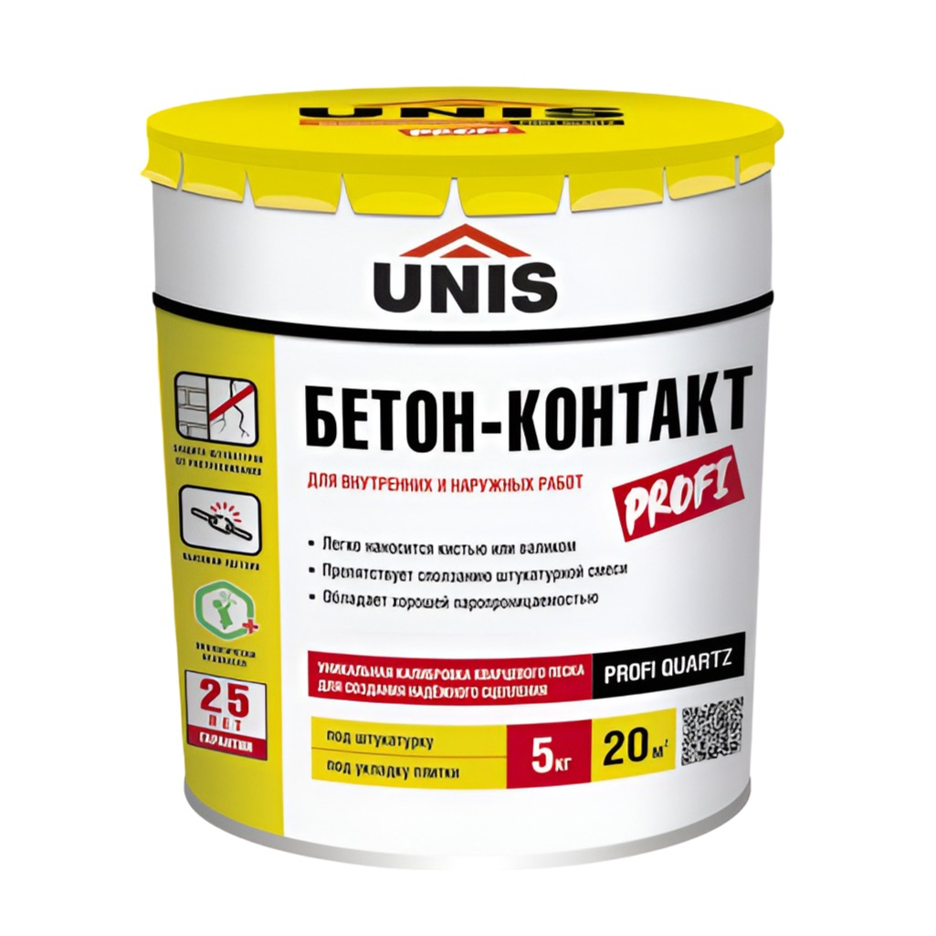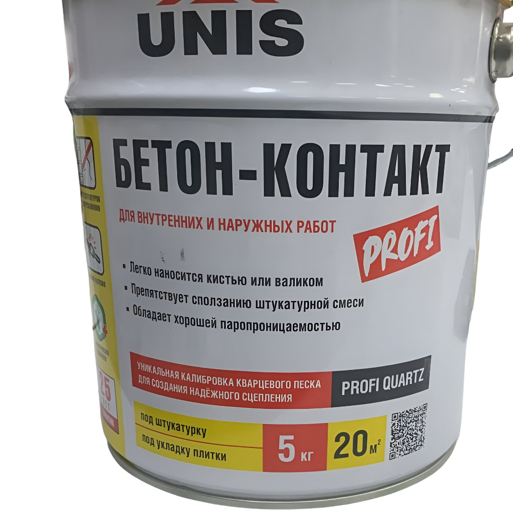 Грунт UNIS Бетон-Контакт Profi, с кварцевым наполнителем, для внутренних и наружных работ, 5 кг предназначен для подготовки поверхностей перед нанесением клеев, стяжек и штукатурок. Подходит для внутренних и наружных работ, а также для обработки слабо впитывающих и не впитывающих оснований. Этот грунт особенно полезен при укладке новой керамической плитки на старую поверхность и для подготовки старых лакокрасочных покрытий перед перекраской. Его особенность — специальная композиция кварцевых наполнителей, называемых PROFI QUARTZ. Это откалиброванный мелкофракционный песок, который облегчает и ускоряет нанесение грунта. Благодаря ему, грунт можно наносить тонким слоем, что снижает расход и обеспечивает паропроницаемость покрытия. Грунт можно использовать на монолитных бетонах, бетонных блоках, керамических и каменных облицовках, а также прочных лакокрасочных покрытиях.