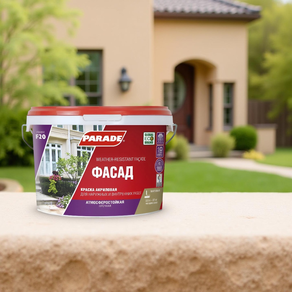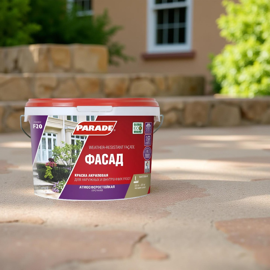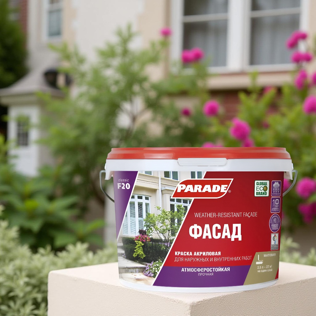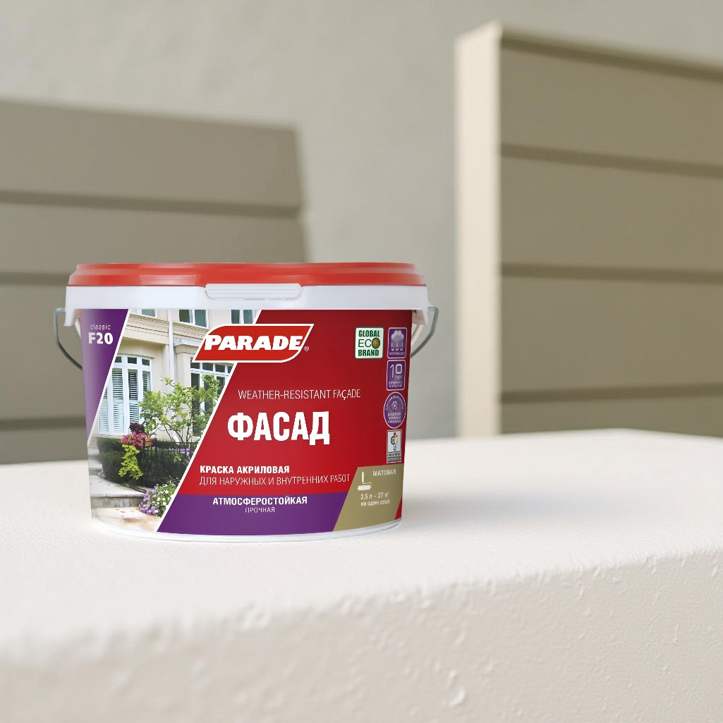 Описание краски PARADE classic Фасад F20 атмосферостойкая, База А, белая, 2.5 л