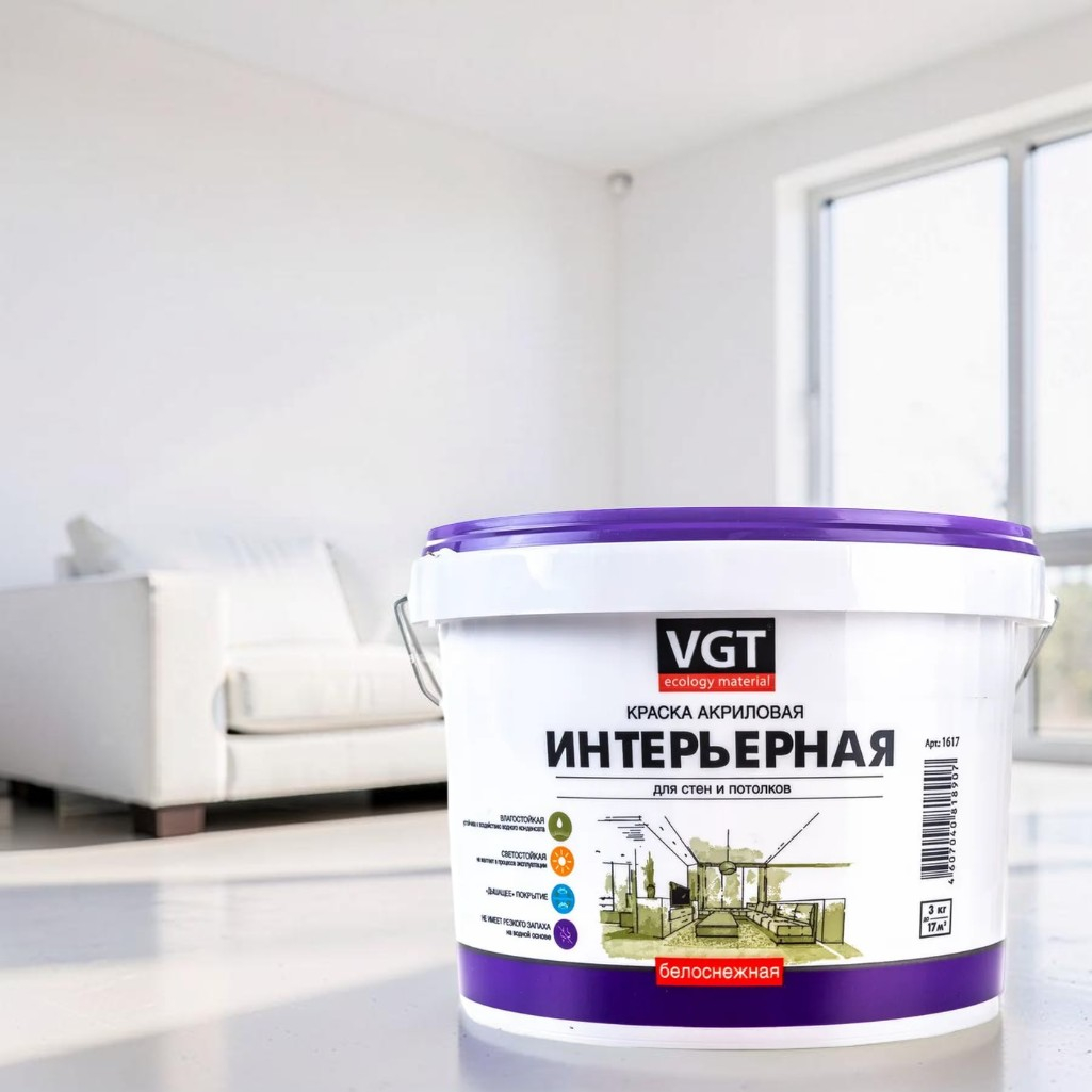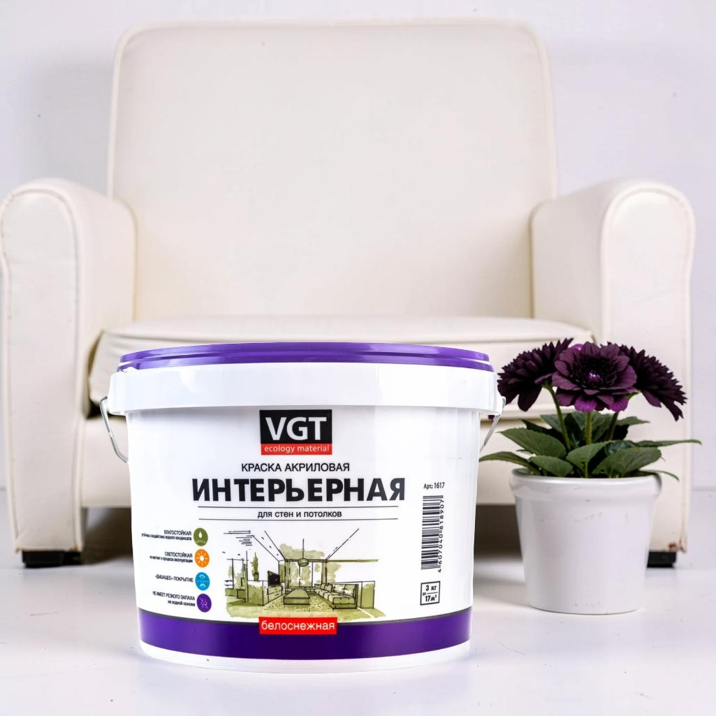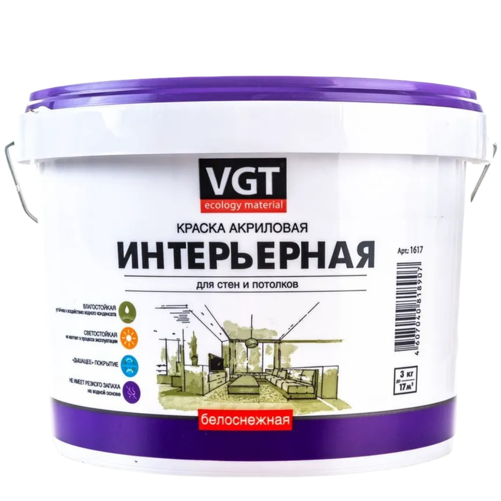 Краска акриловая ВГТ ВД-АК-2180 интерьерная, для стен и потолков, белоснежная, матовая, 3 кг в Москве