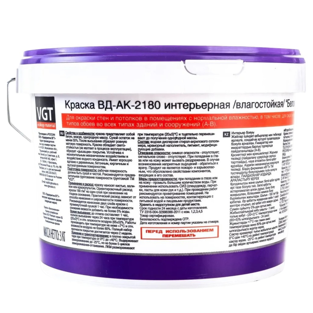 Технические характеристики краски ВГТ ВД-АК-2180 для стен и потолков, интерьерная, влагостойкая, белоснежная, 3 кг