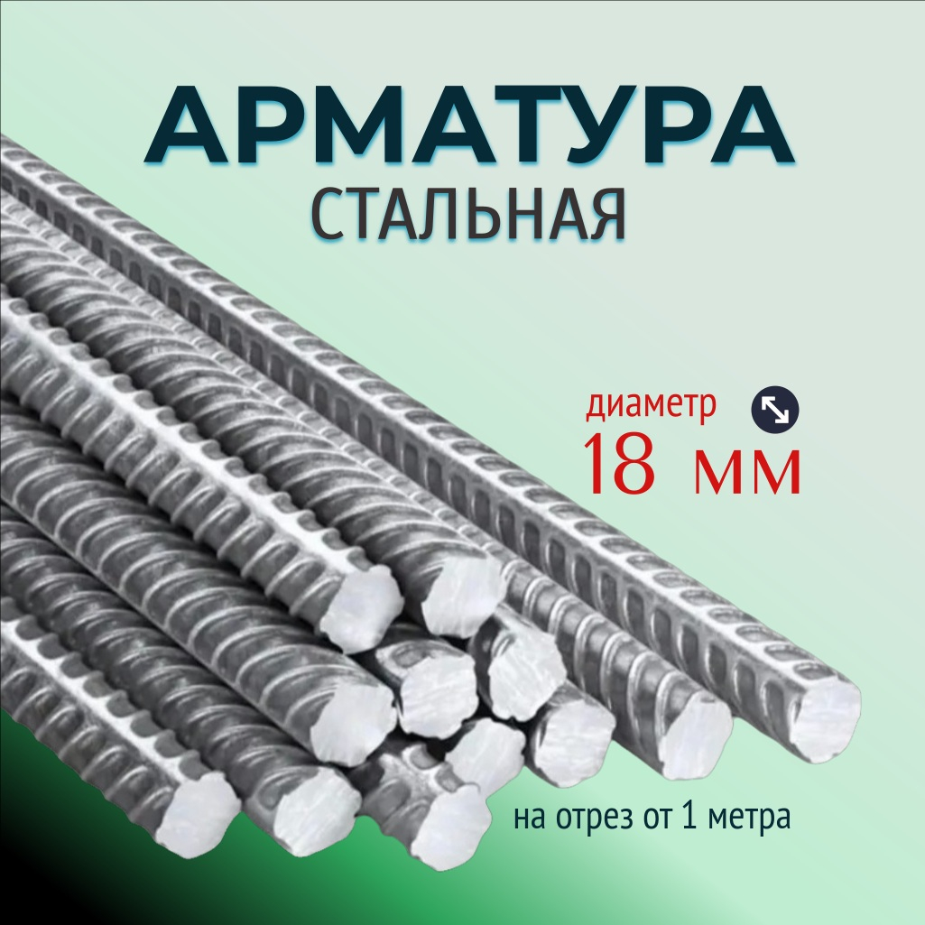 Арматура стальная, диаметр 18 мм, для строительства, на отрез от 1 метра применяется для изготовления всех видов железобетонных конструкций, что необходимо для усиления прочностных характеристик бетона. В основном, применяется стальная гибкая – стержни, сварные сетки и каркасы, но иногда необходима и жесткая – прокатные двутавры, швеллеры и уголки. Так как арматура используется для производства ответственных строительных деталей и конструкций, и должна выдерживать огромные нагрузки, для ее изготовления используется специальная арматурная сталь