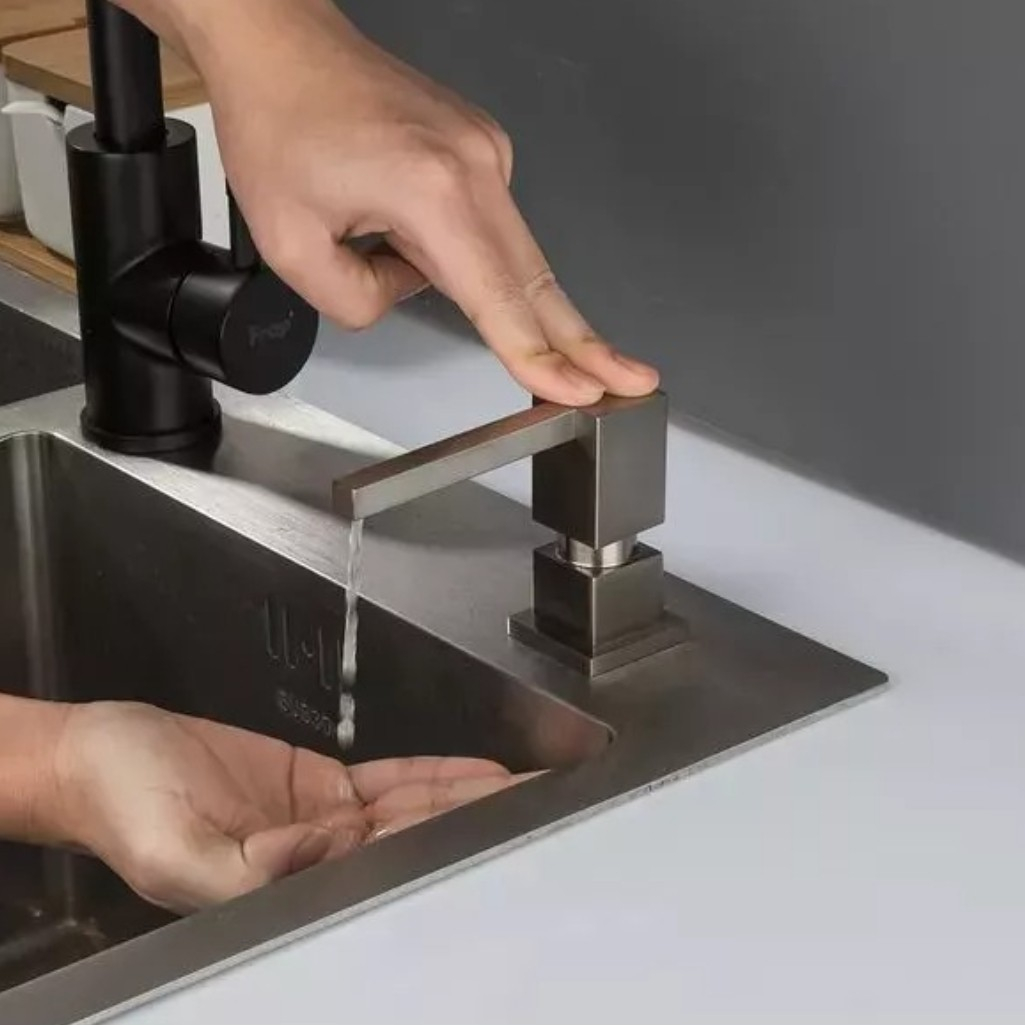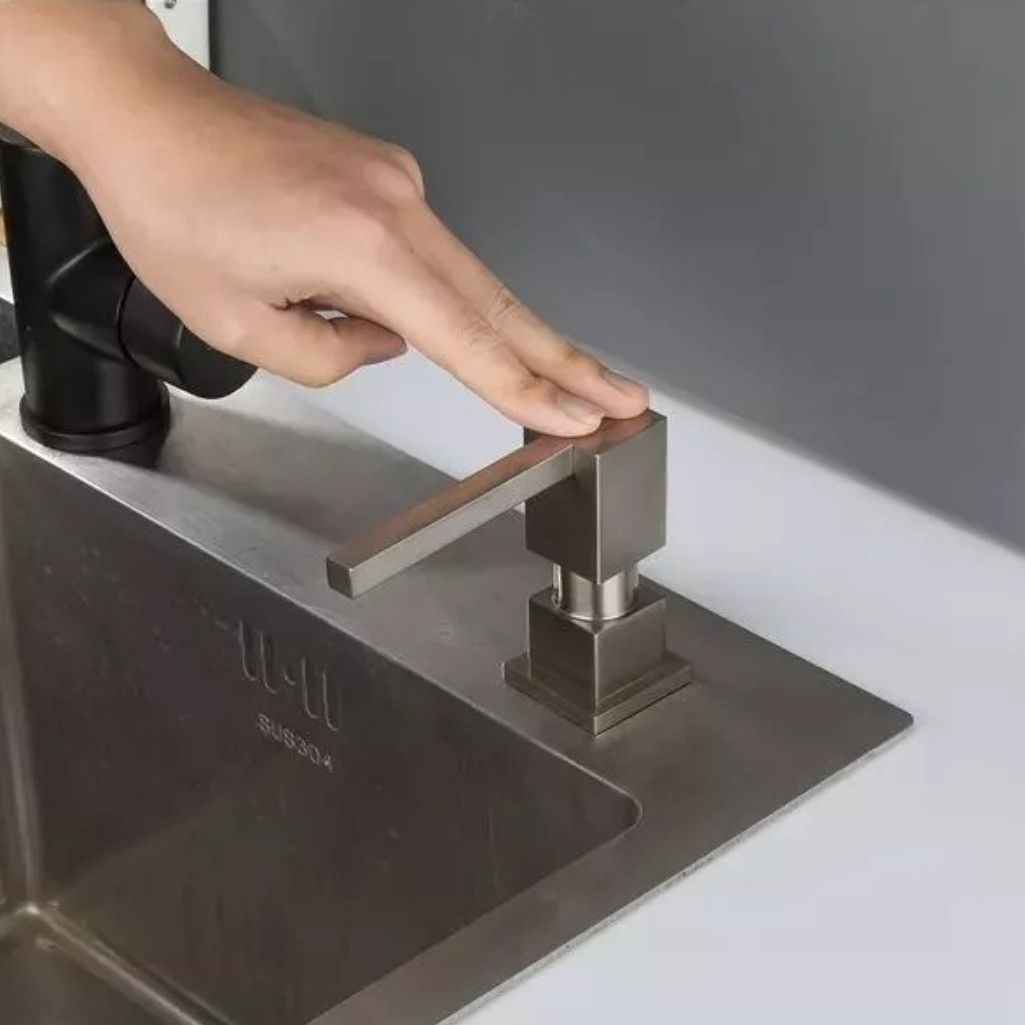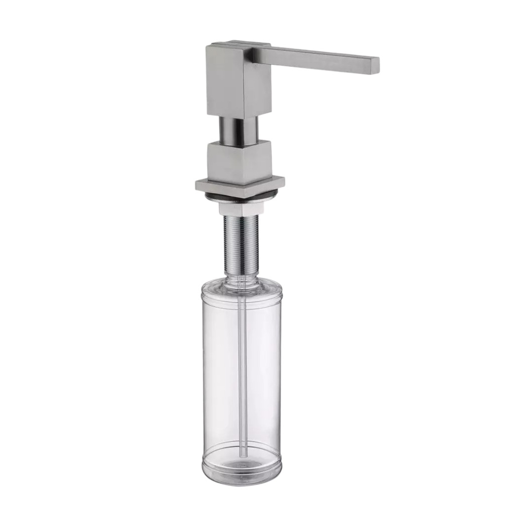 Дозатор жидкого мыла Gappo G404-5 встраиваемый, объем 300 мл, латунь, пластик, сатин предназначен для использования на кухне или в ванной, чтобы для экономного расхода моющего средства. Оно устанавливается в раковину или рядом с ней на столешнице. Резервуар со средством находится под поверхностью, а сверху остается только носик, что исключает риск опрокидывания флакона во время использования. Этот аксессуар не только удобен, но и улучшает внешний вид вашей кухни. Дозатор можно заполнить не только мылом, но и гелем для мытья посуды. Корпус выполнен из латуни и пластика. Монтаж встраиваемый. Объем дозатора составляет 300 мл.
