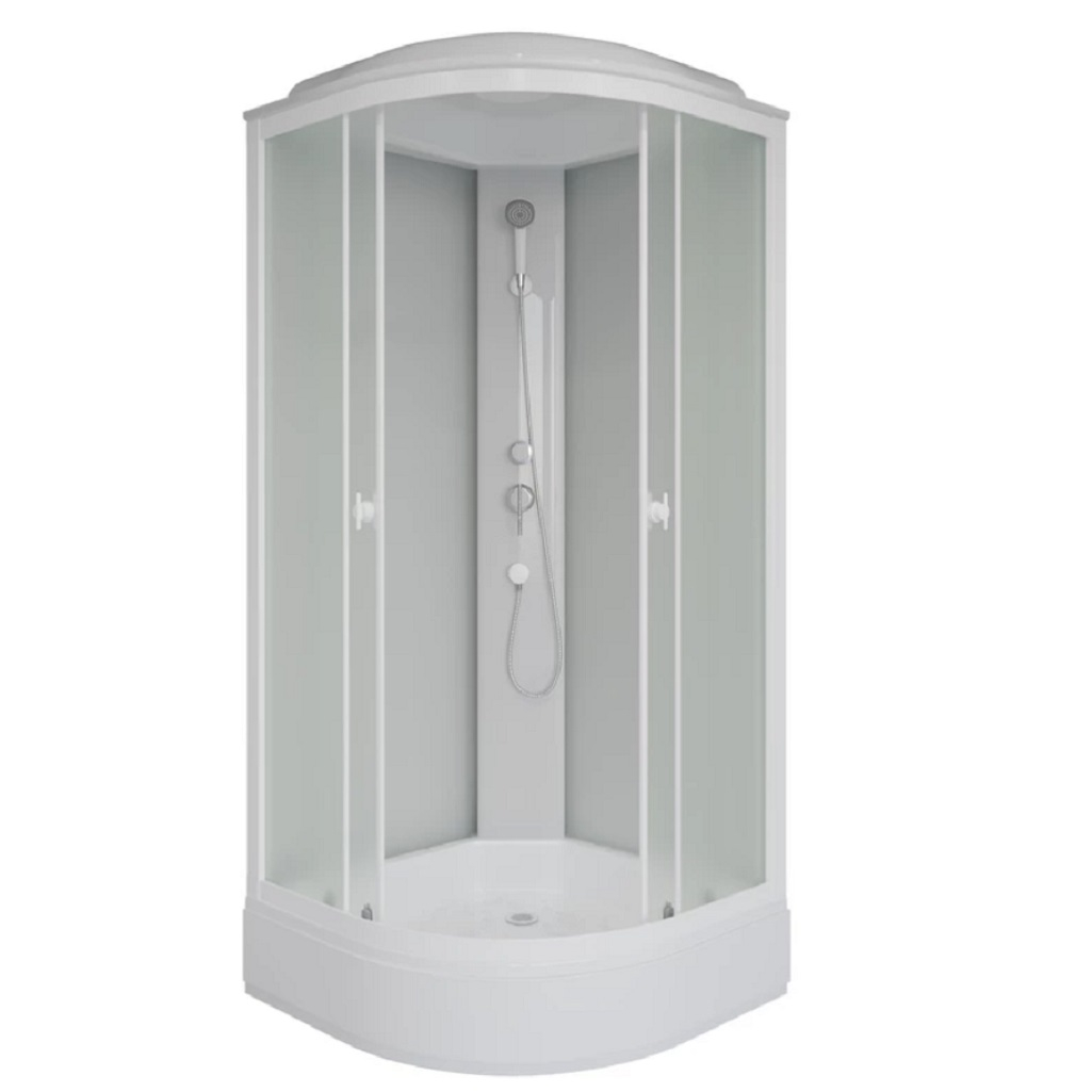 Стенки задние и передние, а также двери выполнены из каленого матового стекла белого цвета, толщина стекла 5 мм. Передние стенки неподвижные, двери - раздвижные. Материал смесителя - латунь, что обеспечивает длительный срок эксплуатации. Смеситель оснащен керамическим картриджем, имеет 2 положения, включает тропический душ и дополнительную душевую лейку.