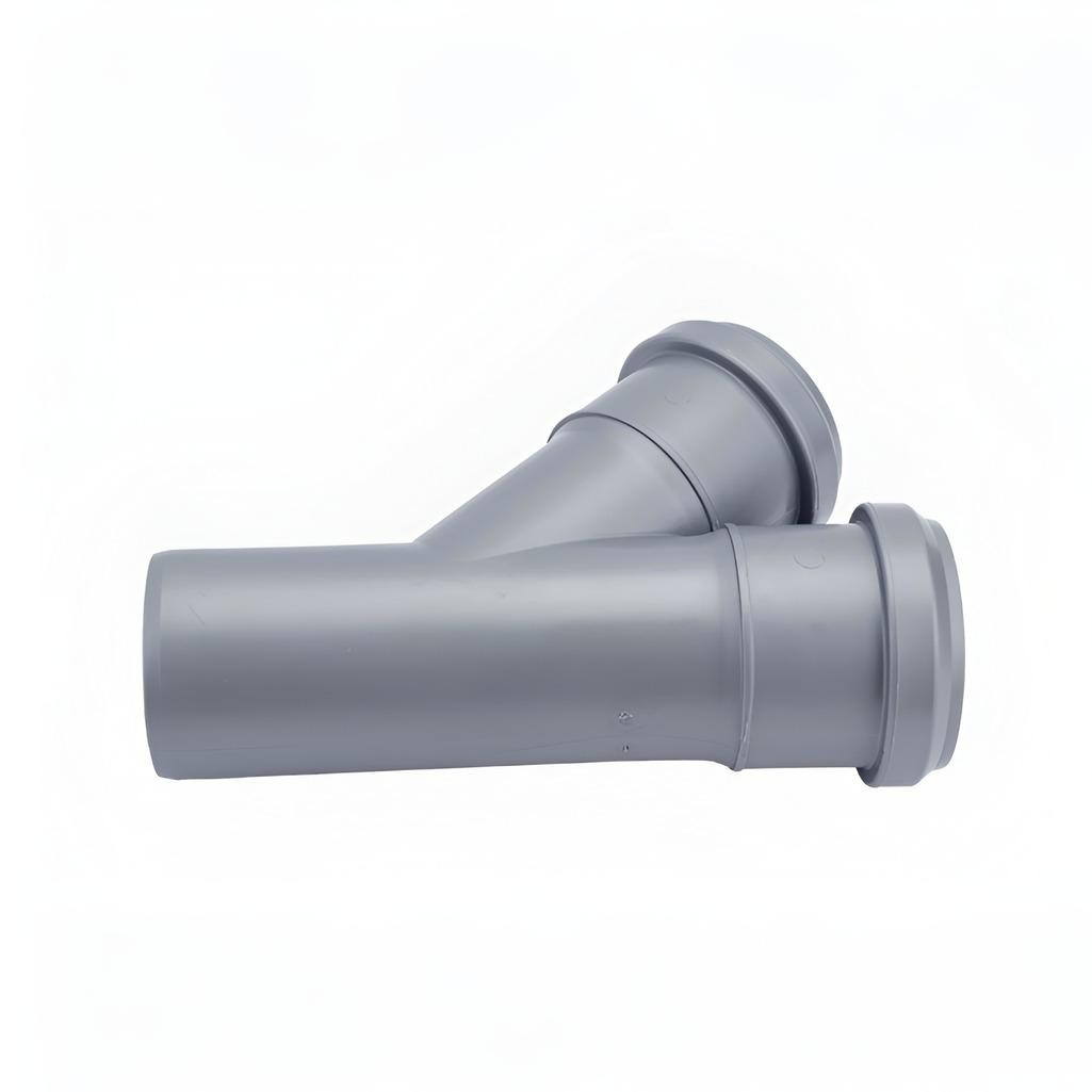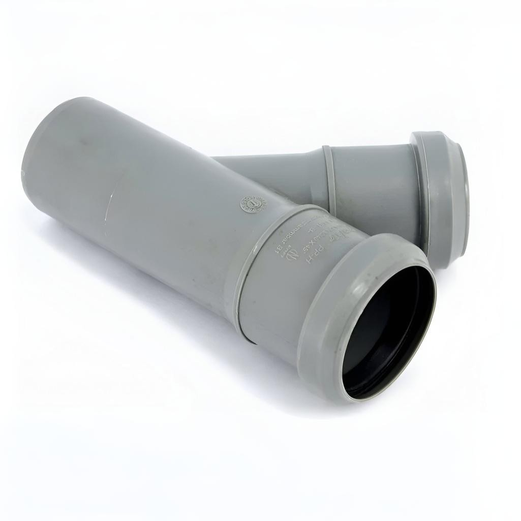 Тройник канализационный 45 гр., Sinikon 508013R, диаметр 50х50 мм, полипропилен, серый — полипропиленовая фасонная деталь для создания ответвлений в системах внутренней канализации. Предназначен для плавного соединения трёх труб одинакового диаметра с минимальной турбулентностью и низким уровнем шума.