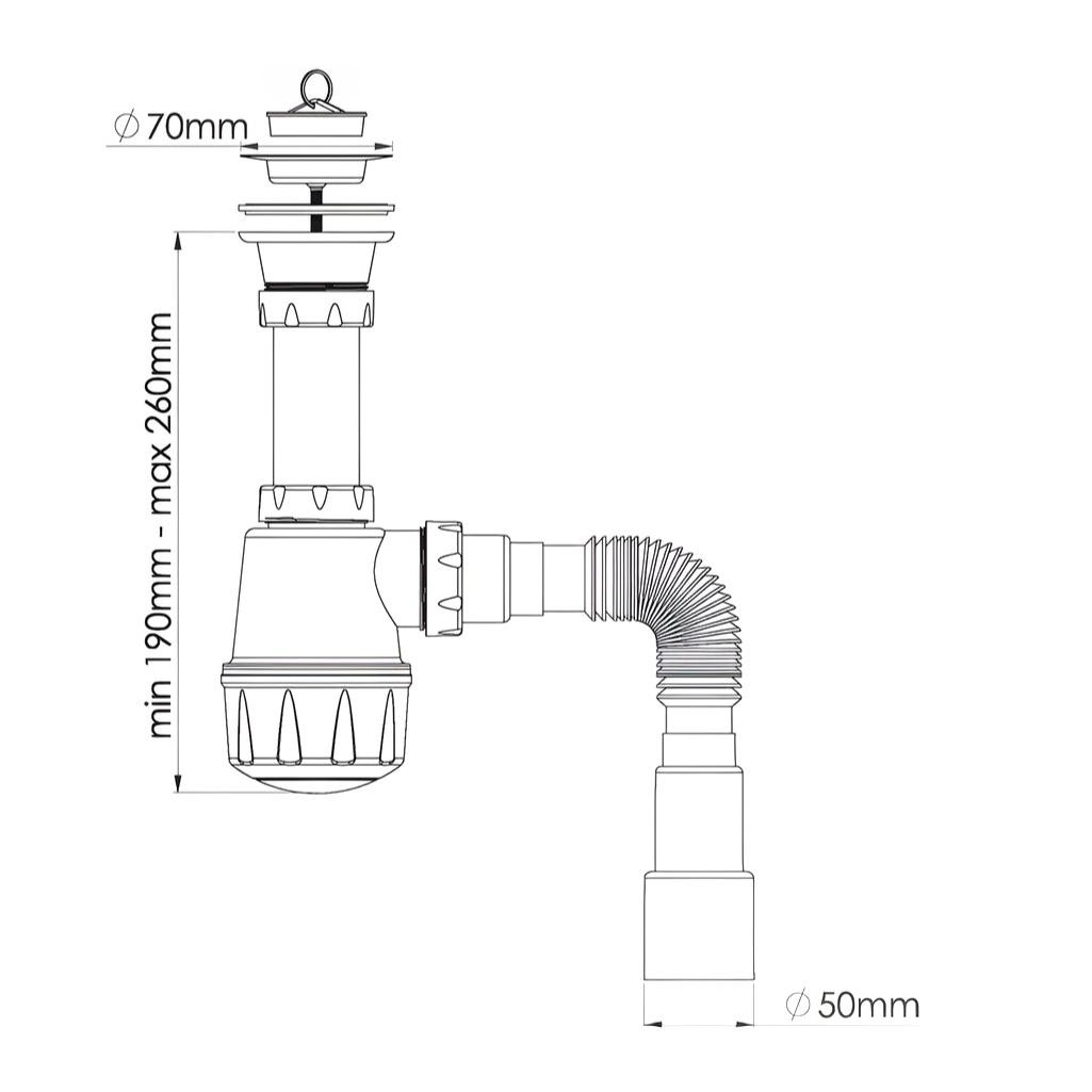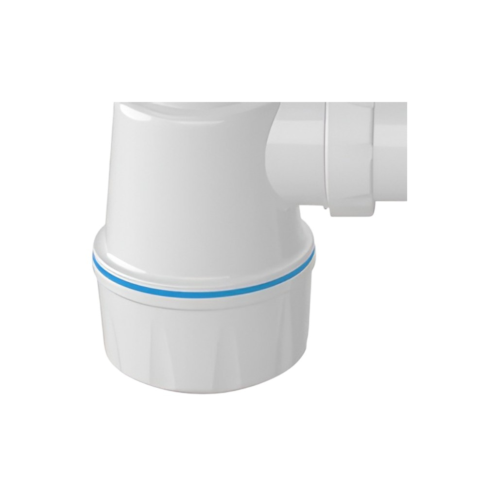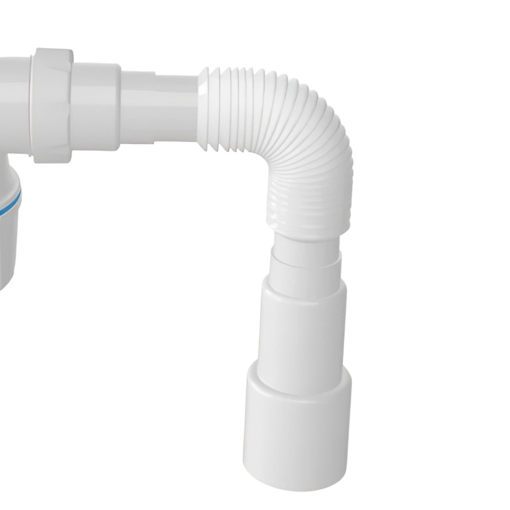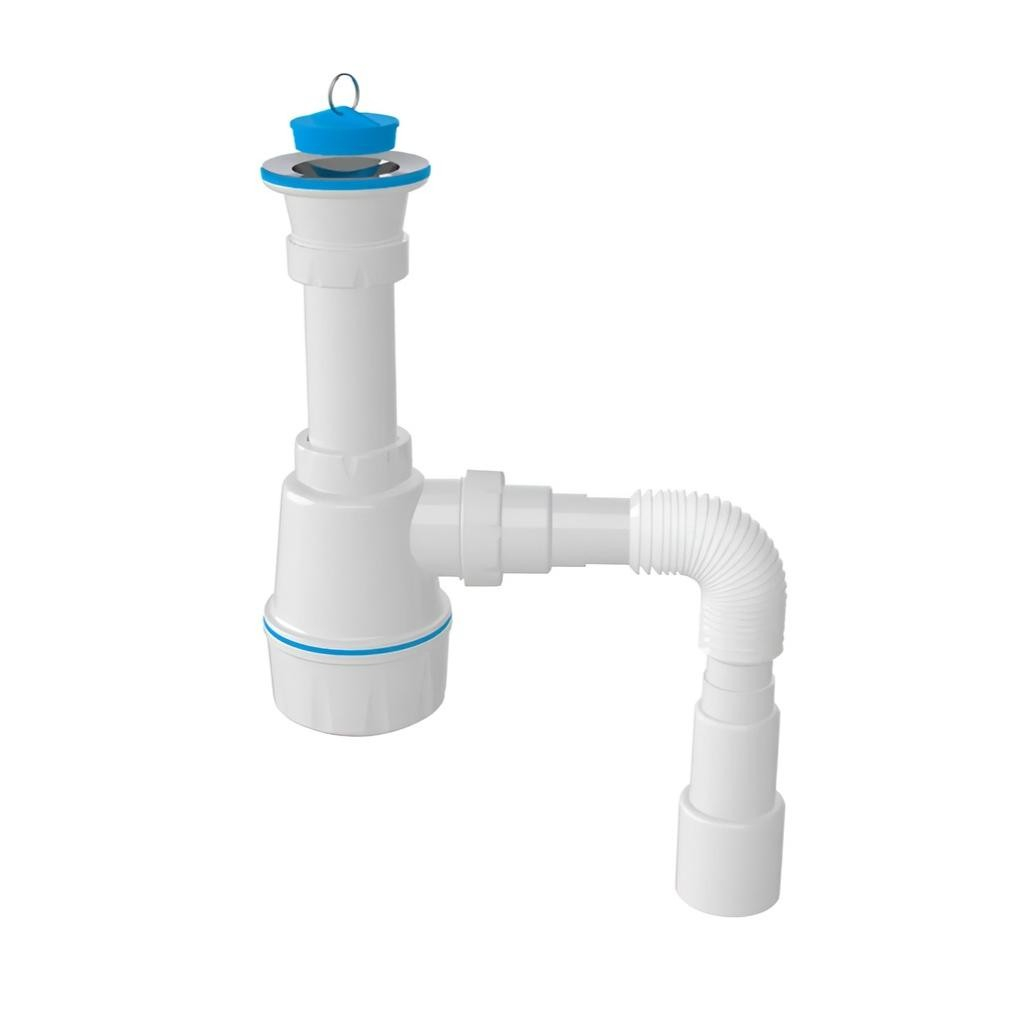 Сифон бутылочный Nova 1060 для мойки, выпуск 70 мм, 50-1 1/2", белый — сливная система с увеличенной колбой для кухонных моек. Оснащён выпуском 70 мм, винтом длиной 50 мм и гибкой выходной трубой 1½"-40/50 мм для универсального подключения к канализации.