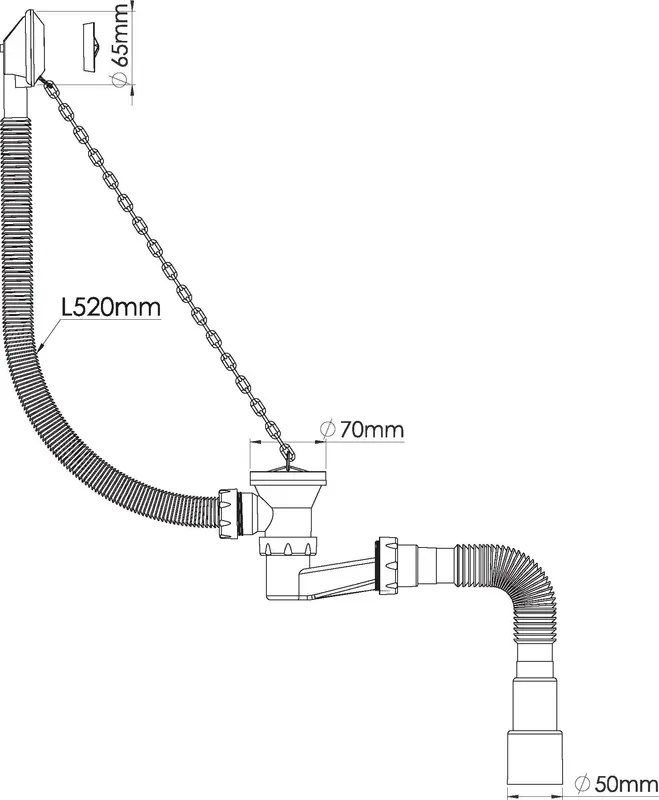 Технические характеристики сифона гофрированного Nova Plumbing Solution 1521 для ванны, 40/50-1 1/2", с пластмассовой цепочкой, белого