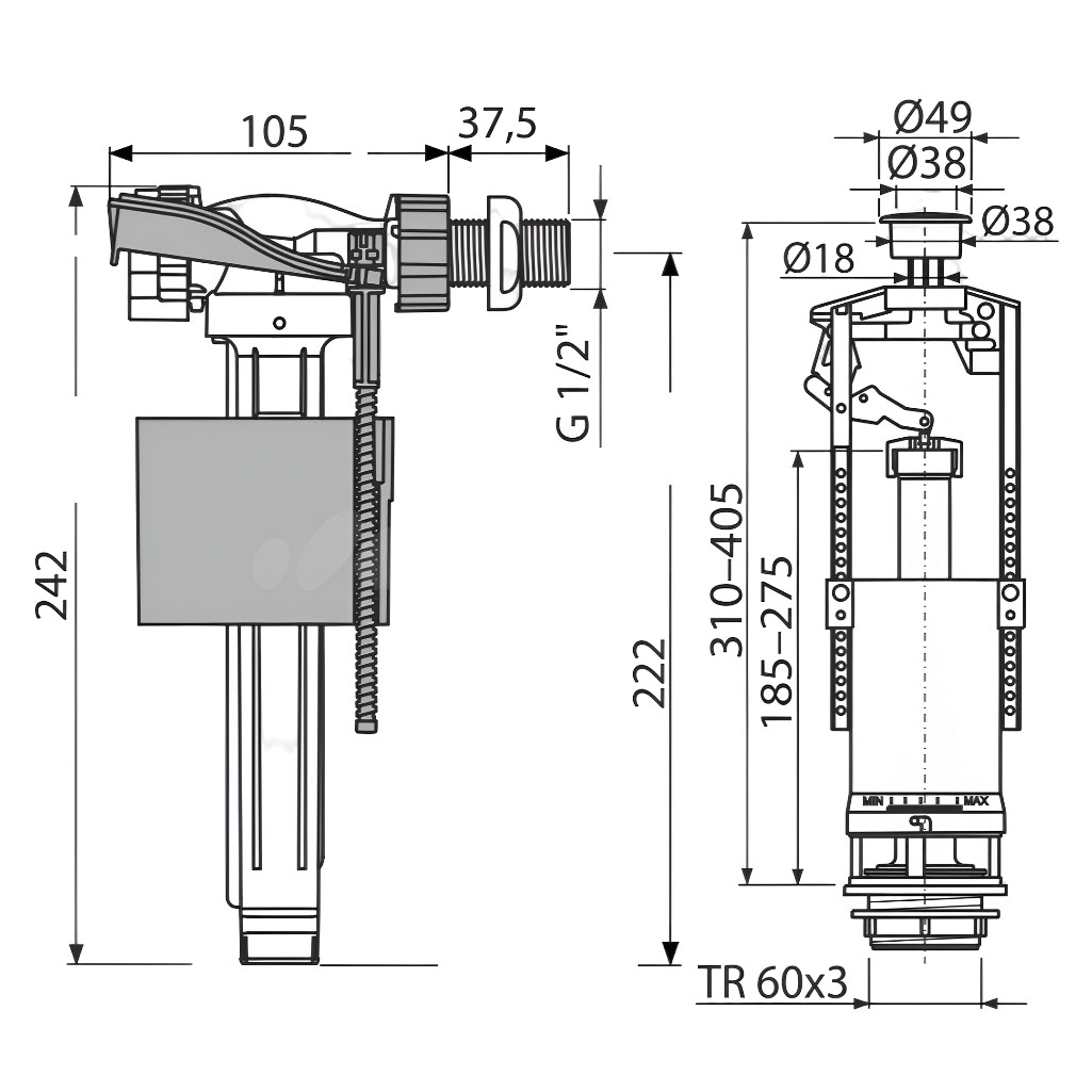 Технические характеристики комплекта арматуры Alcaplast SA2000 для унитаза, боковой подвод, 1/2", пластик