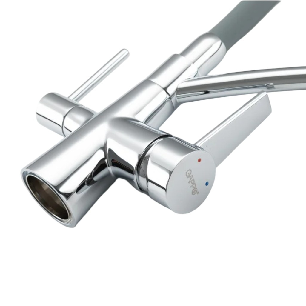 Смеситель для кухни Gappo G4398-17, серый/хром — это однорычажный смеситель с гибким изливом и функцией подключения фильтра питьевой воды. Модель объединяет два крана в одном корпусе и отличается эргономичным современным дизайном.