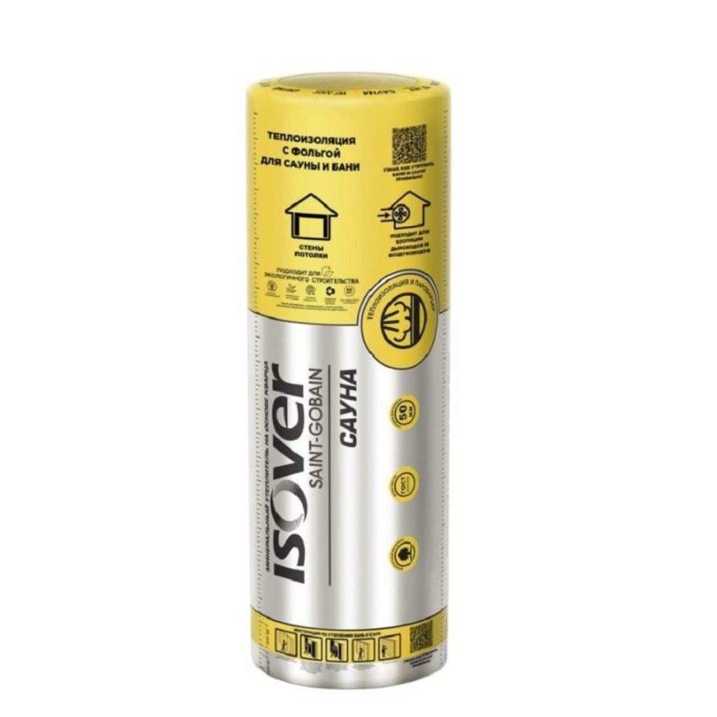 Утеплитель Isover Сауна Saint-gobain фольга, для стен, 50х1200х12500 мм, 15 кв.м, рулон, разработанный специально для бань и саун, сочетает в себе функции теплоизоляции и пароизоляции, обеспечивая комфортное и безопасное использование.