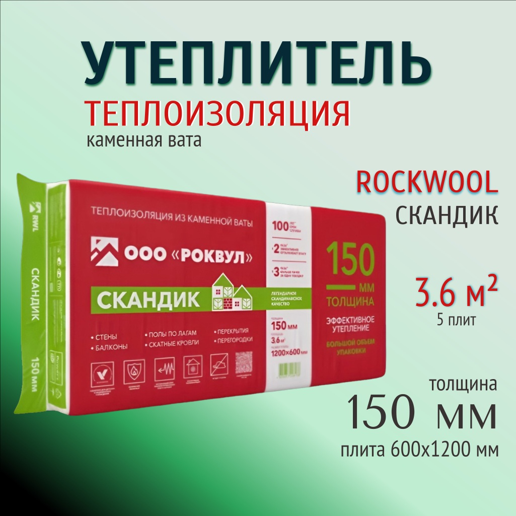 Утеплитель Rockwool Скандик для стен, пола, перекрытий, 150х600х1200 мм, 3.6 кв.м, 5 плит - инновационный плиточный материал с наилучшими характеристиками в своем классе. Разработан специалистами компании Rockwool специально для частных застройщиков. Область применения – обустройство теплоизоляционного ненагружаемого слоя скатной кровли, межэтажных перекрытий, уложенных на лаги полов, ограждающих конструкций каркасных домов, внутренних перегородок, балконов и лоджий.