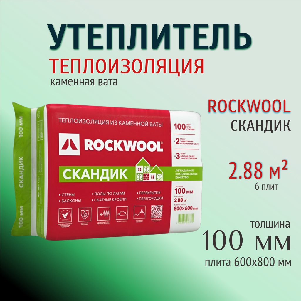Утеплитель Rockwool Скандик для стен, пола, перекрытий, 100х600х800 мм, 2.88 кв.м, 6 плит