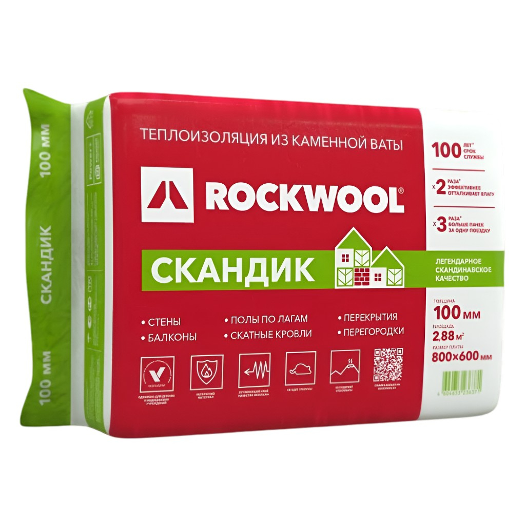 Описание утеплителя Rockwool Скандик для стен, пола, перекрытий, 100х600х800 мм, 2.8 кв.м, 6 плит