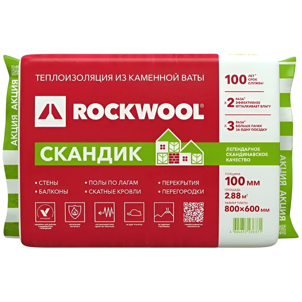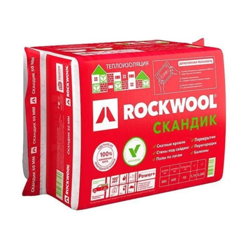 Описание утеплителя Rockwool Скандик для стен, пола, перекрытий, 50х600х800 мм, 5.76 кв.м, 12 плит