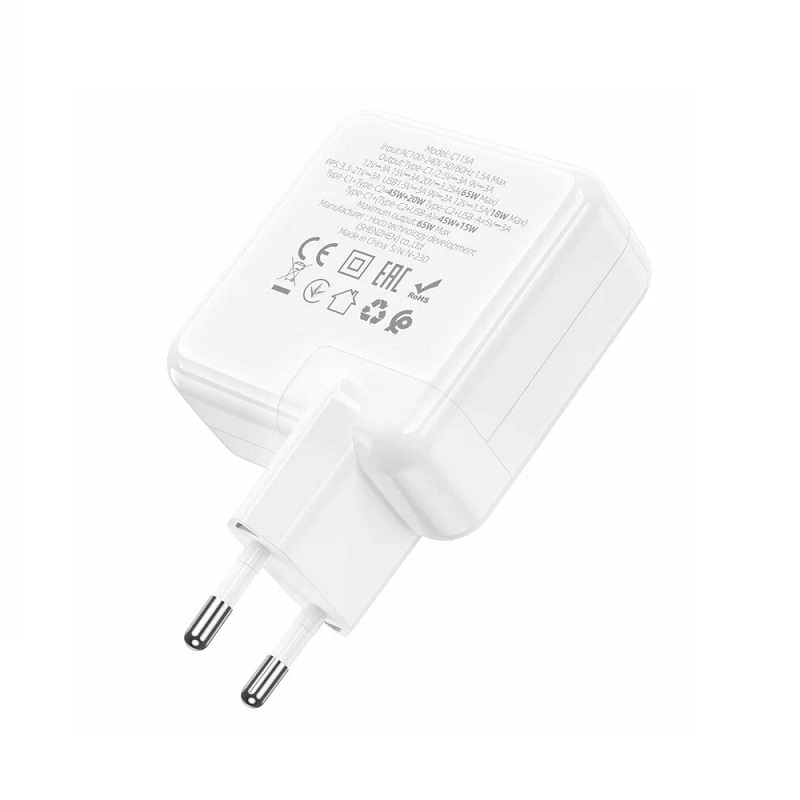 Сетевое зарядное устройство HOCO C115A 65W - это современное и функциональное решение для зарядки ваших устройств. Оно обеспечивает быструю зарядку двух устройств одновременно благодаря двум портам USB-C и USB-A.